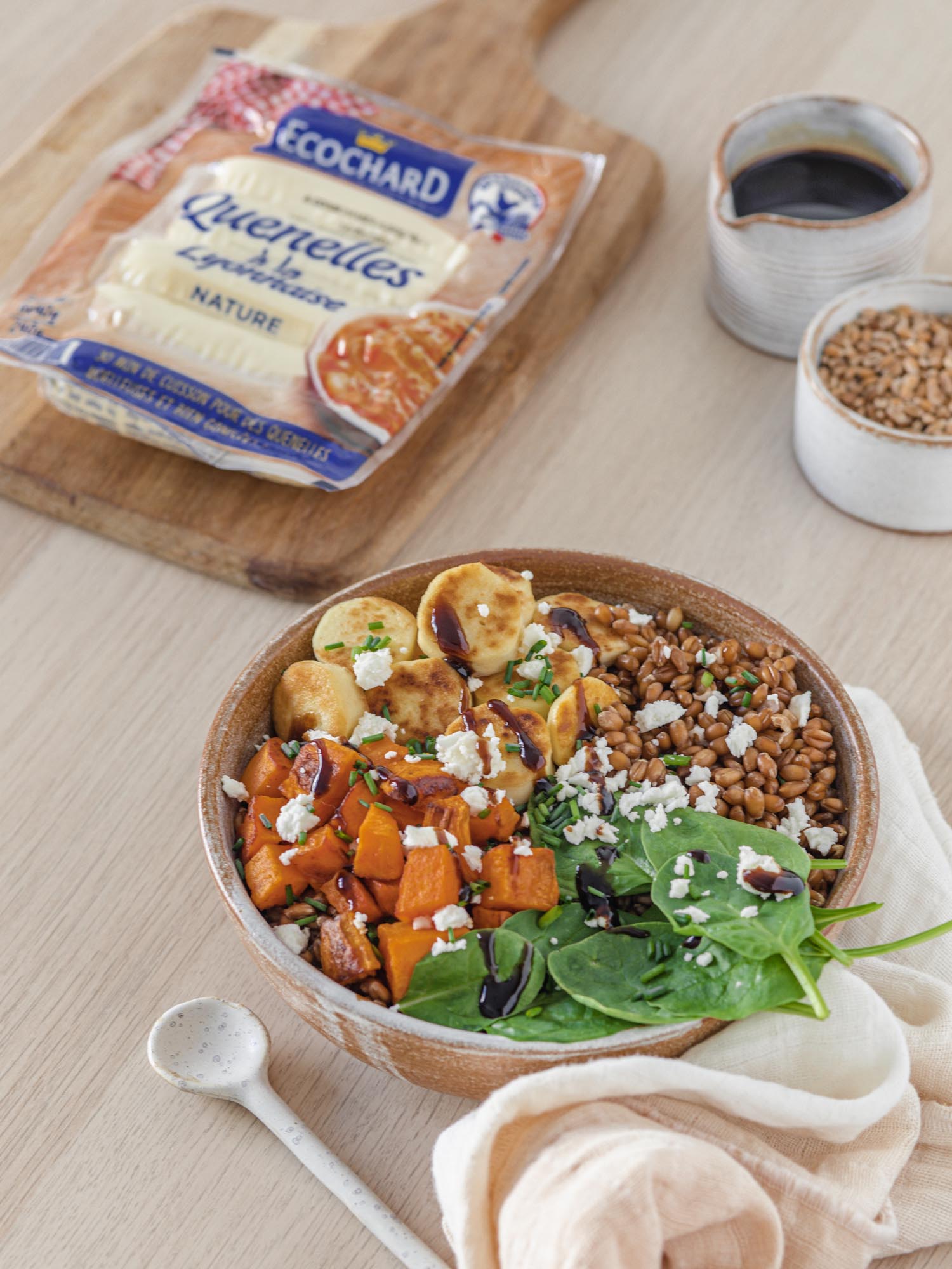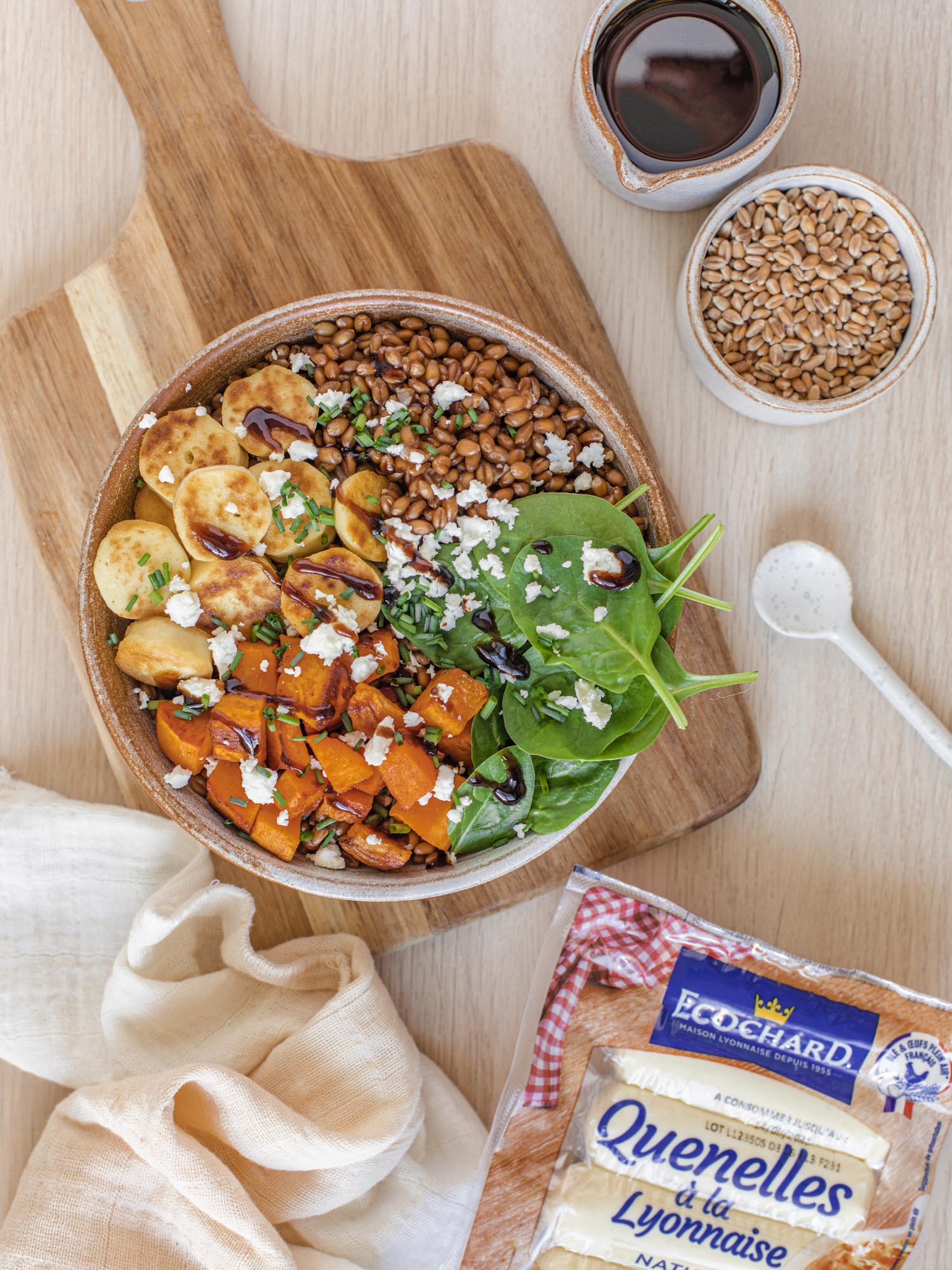 L’automne ayant pointé le bout de son nez, je me suis dit que cela pourrait être sympa de faire un bowl façon buddha bowl avec des saveurs d’automne et d’y intégrer les quenelles à la lyonnaise nature Ecochard. Du blé (que j’achète dans mon magasin vrac préféré), de la patate douce rôtie au paprika, des pousses d’épinards, un peu de fêta… et pour les quenelles, je les ai juste snackées à la poêle avec un petit peu de beurre. Bref, un vrai régal ! Et pour info, les quenelles Ecochard sont à base de blé et œufs plein air français. D’ailleurs, saviez-vous que Ecochard est la seule marque de quenelles à avoir la totalité de ses gammes en 100% œufs plein air français ?!