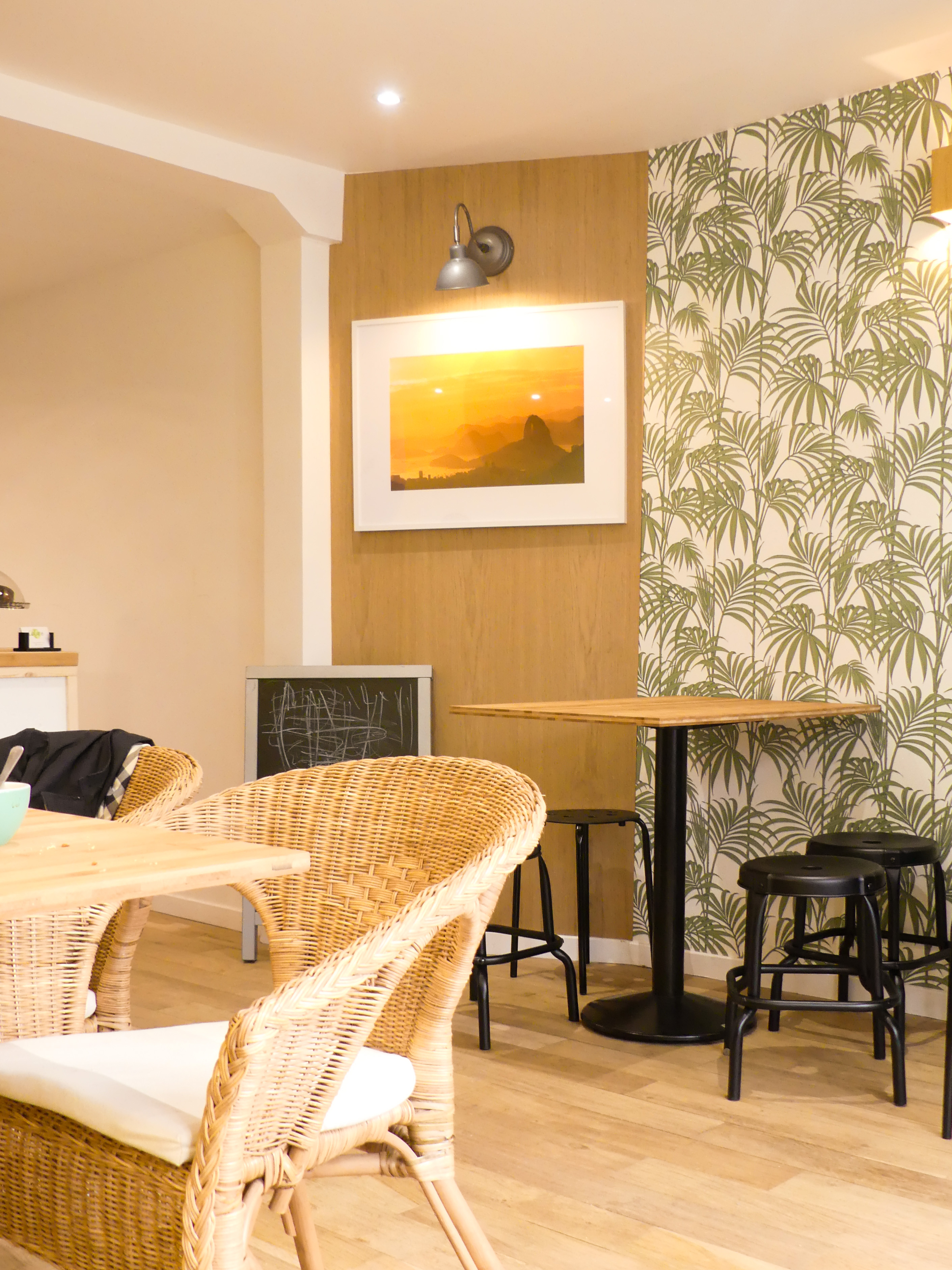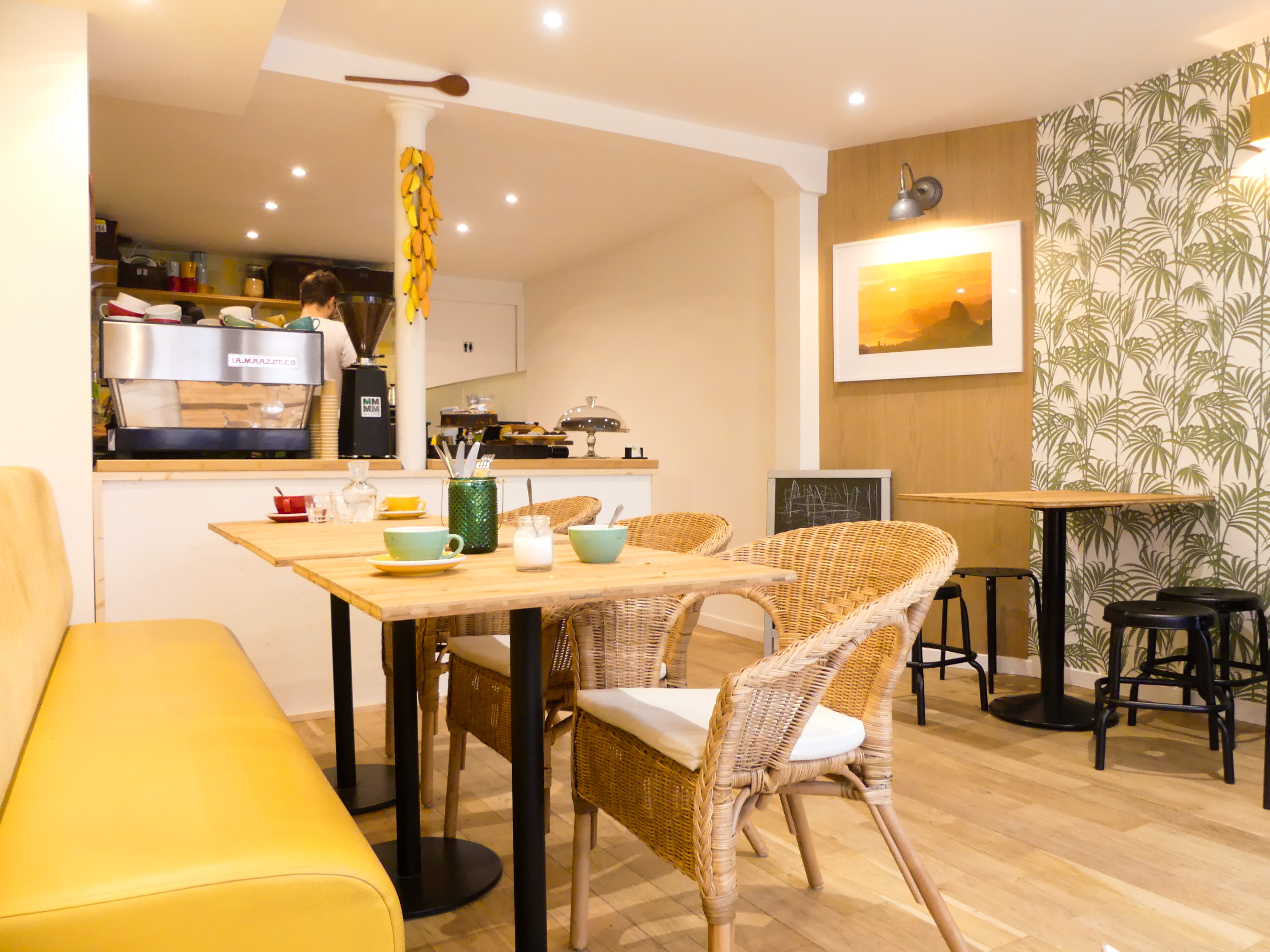 Lorsque l’on pousse la porte de ce coffee-shop, on y trouve le soleil du Brésil allié à une décoration moderne et cosy : un joli mur décoré de feuilles vertes, des restes d’anciens murs en pierre, du bois, des poufs confectionnés à partir de sac de café et des carreaux pastels rappelant les couleurs du drapeau brésilien dans la cuisine. Le cadre est vraiment très mignon et donne envie de rester (c’est un peu le but aussi non ?!).