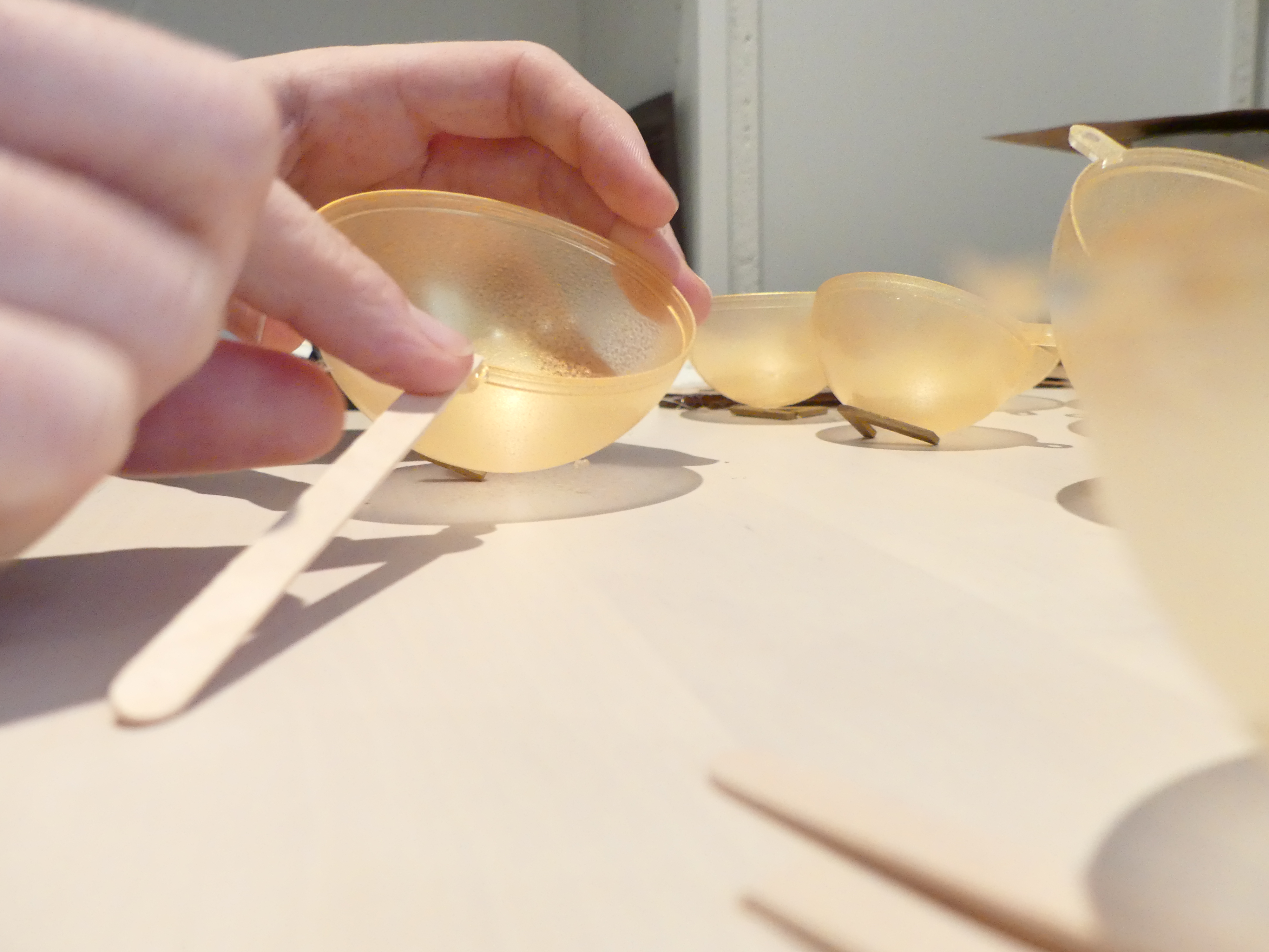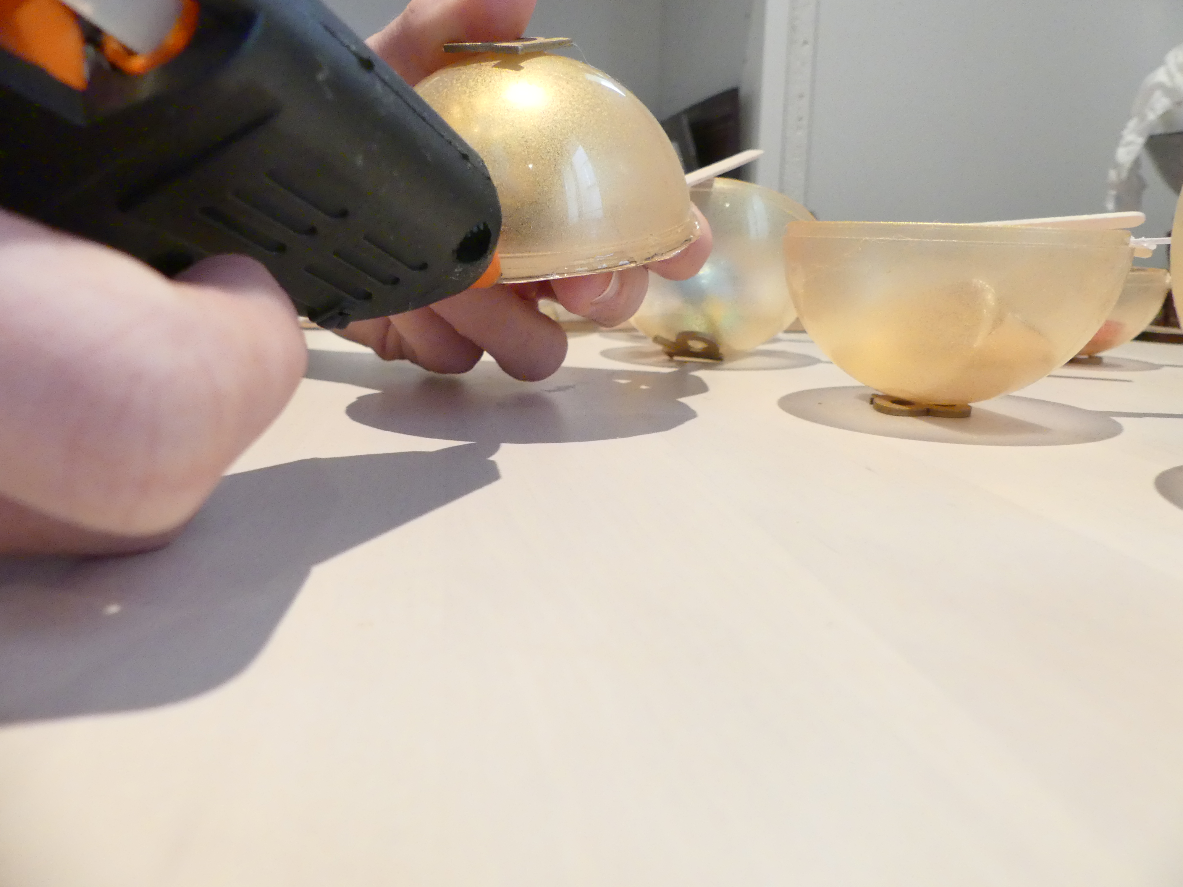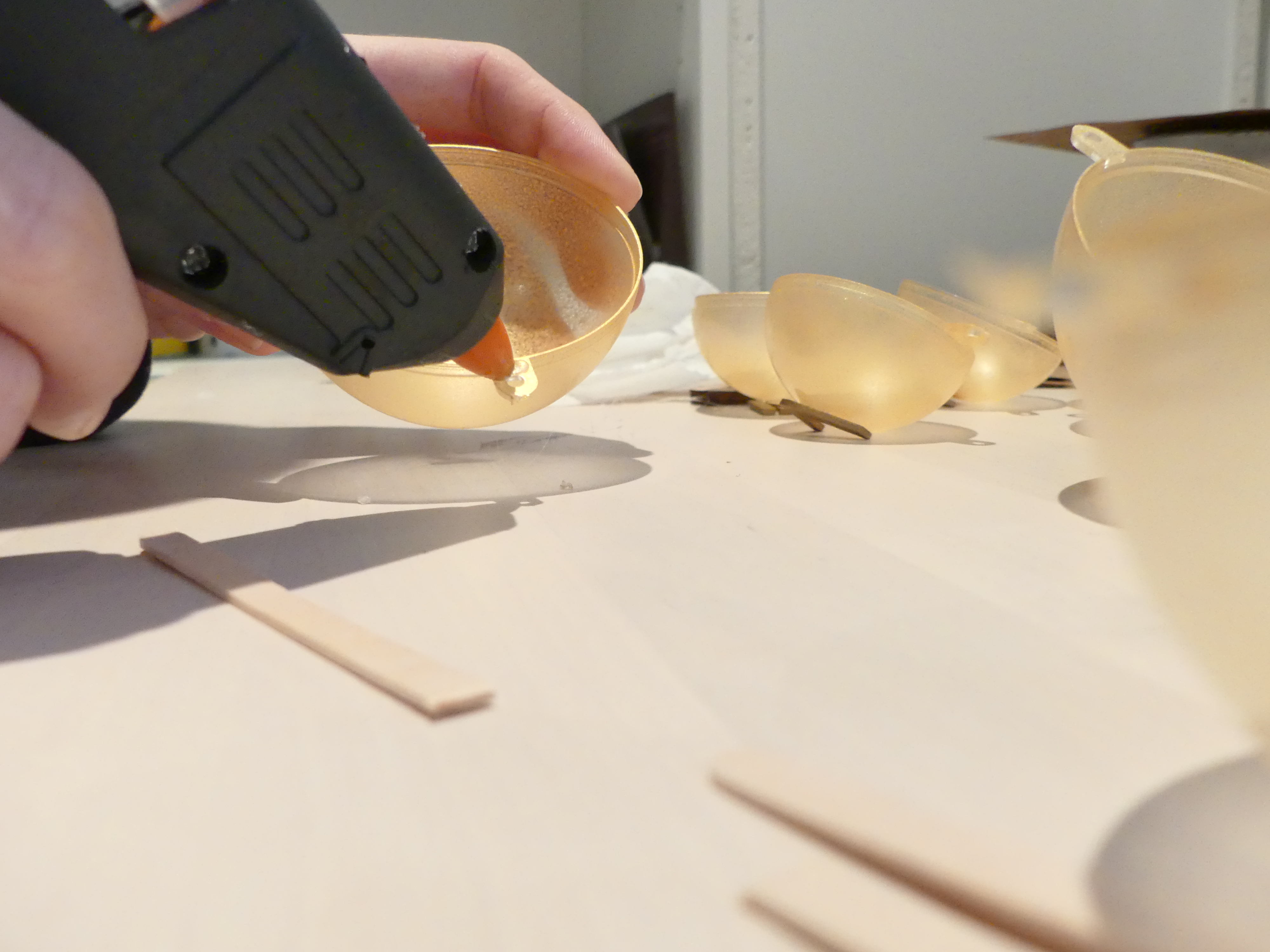 Chaque demi-sphère possède un petit embout dépassant qui permet de passer un fil. Posez un point de colle sur cet embout et collez immédiatement dessus le bâtonnet en bois. Serrez quelques secondes avec vos doigts pour qu’il tienne bien.