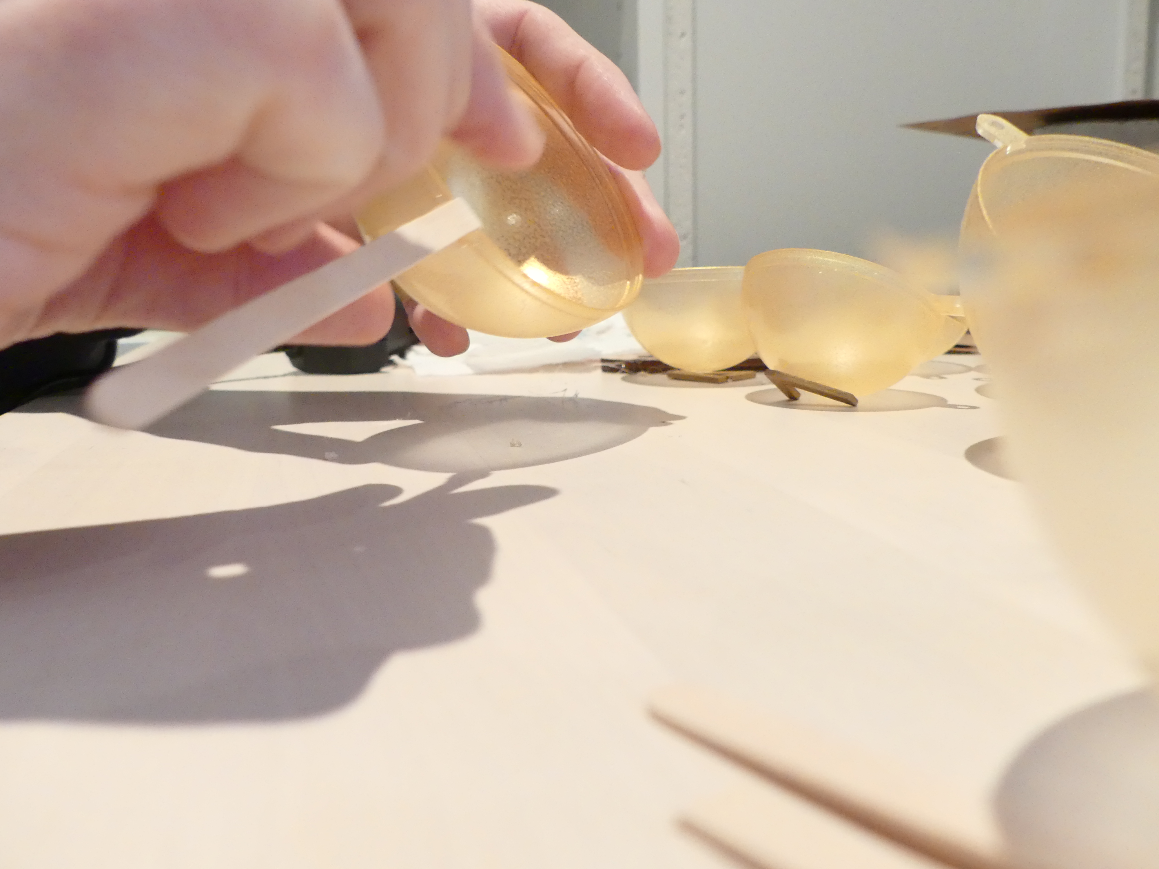 Disposez-les 24 demi-sphères face intérieure vers le haut sur votre drap et sprayer de façon à ce qu’une fine pellicule dorée recouvre légèrement l’intérieur. Plus vous sprayez de loin, plus la pellicule sera fine.