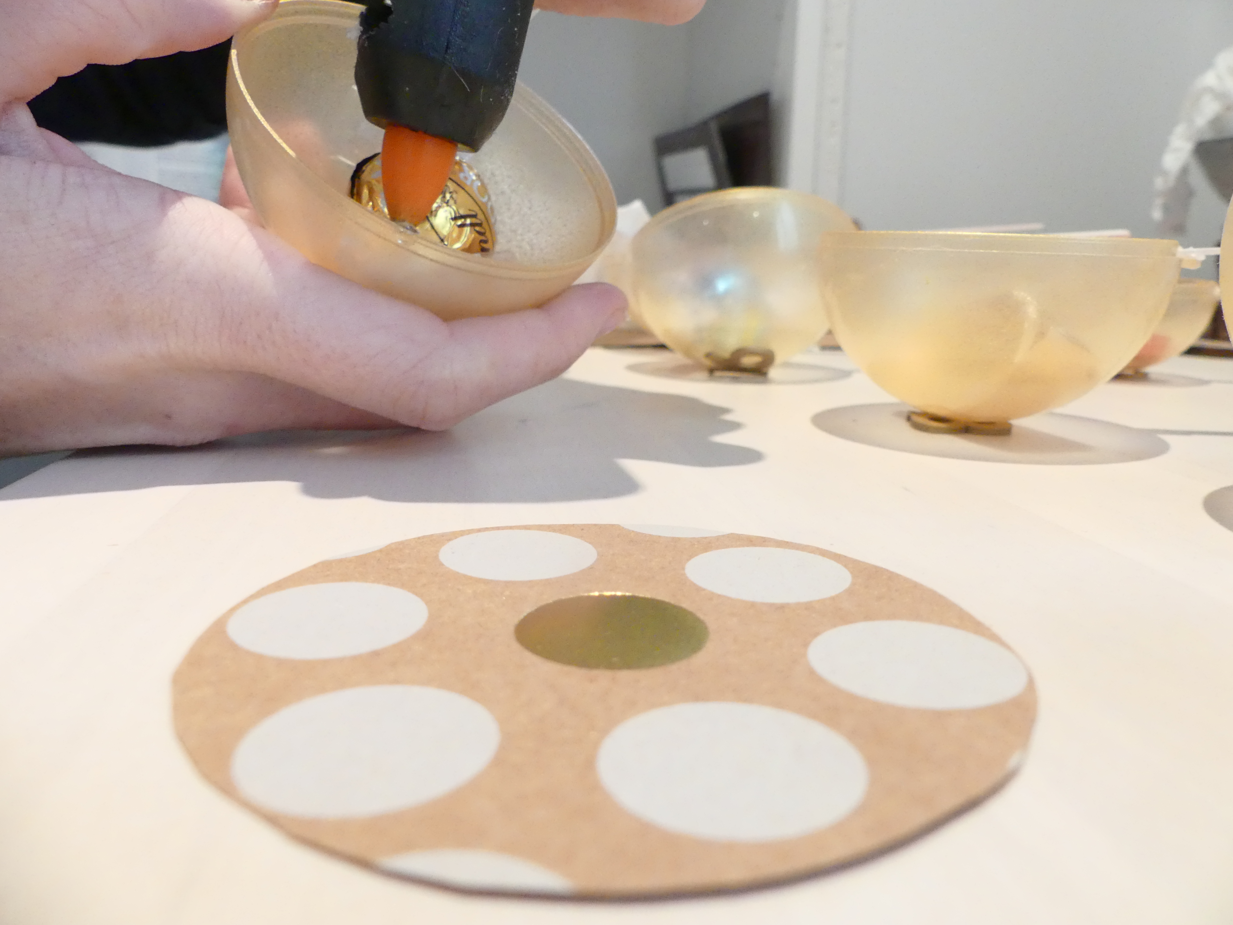 Placez votre rond de papier sur la partie ouverte de la demi-sphère et appuyez quelques secondes au niveau des 2 points de colle. Collez ensuite tout le bord de la sphère au papier cartonné.