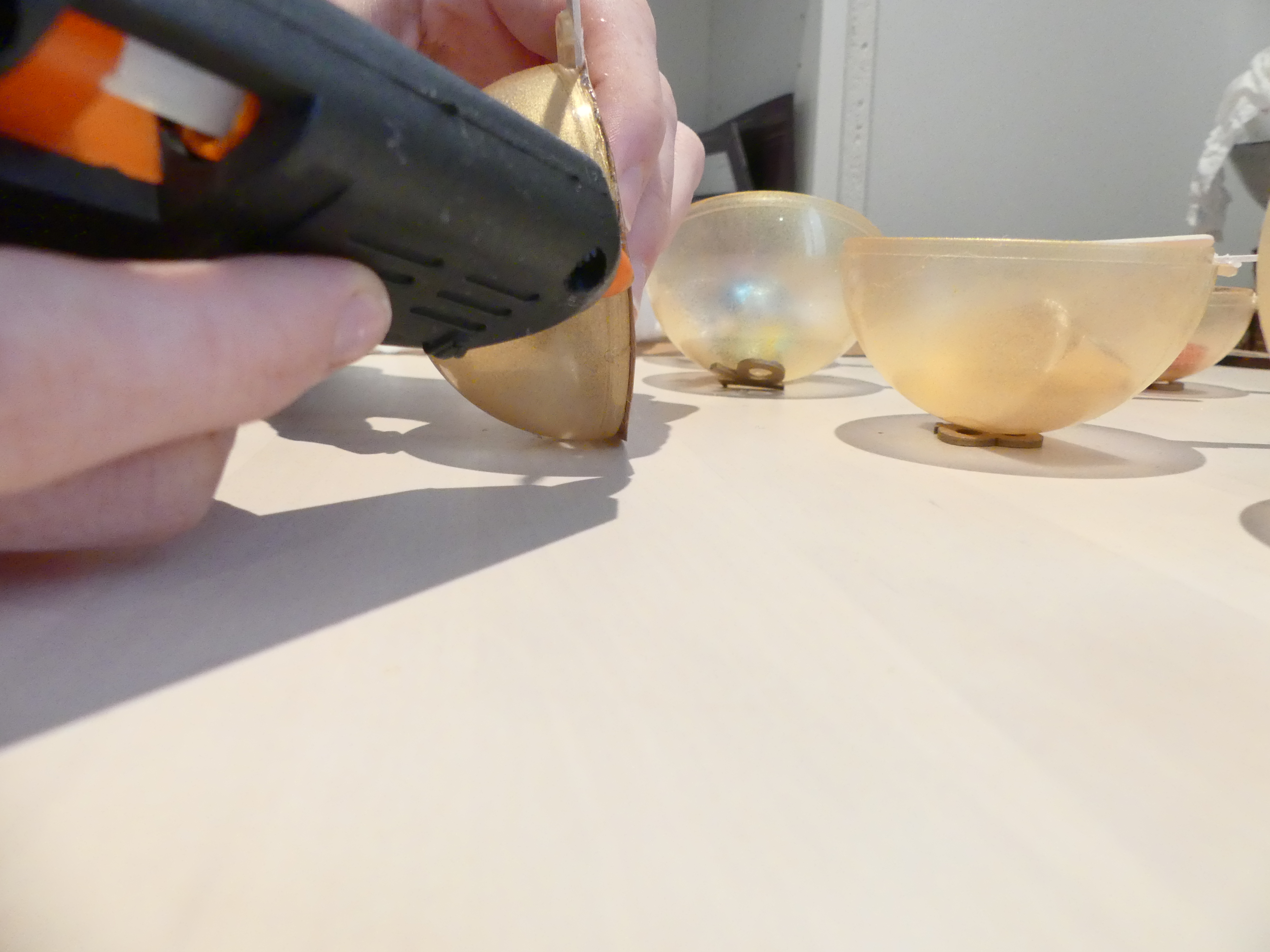 - 12 sphères en plastiques qui s’ouvre en 2 (j’ai pris 2 tailles différentes : 6cm et 4cm de diamètre)