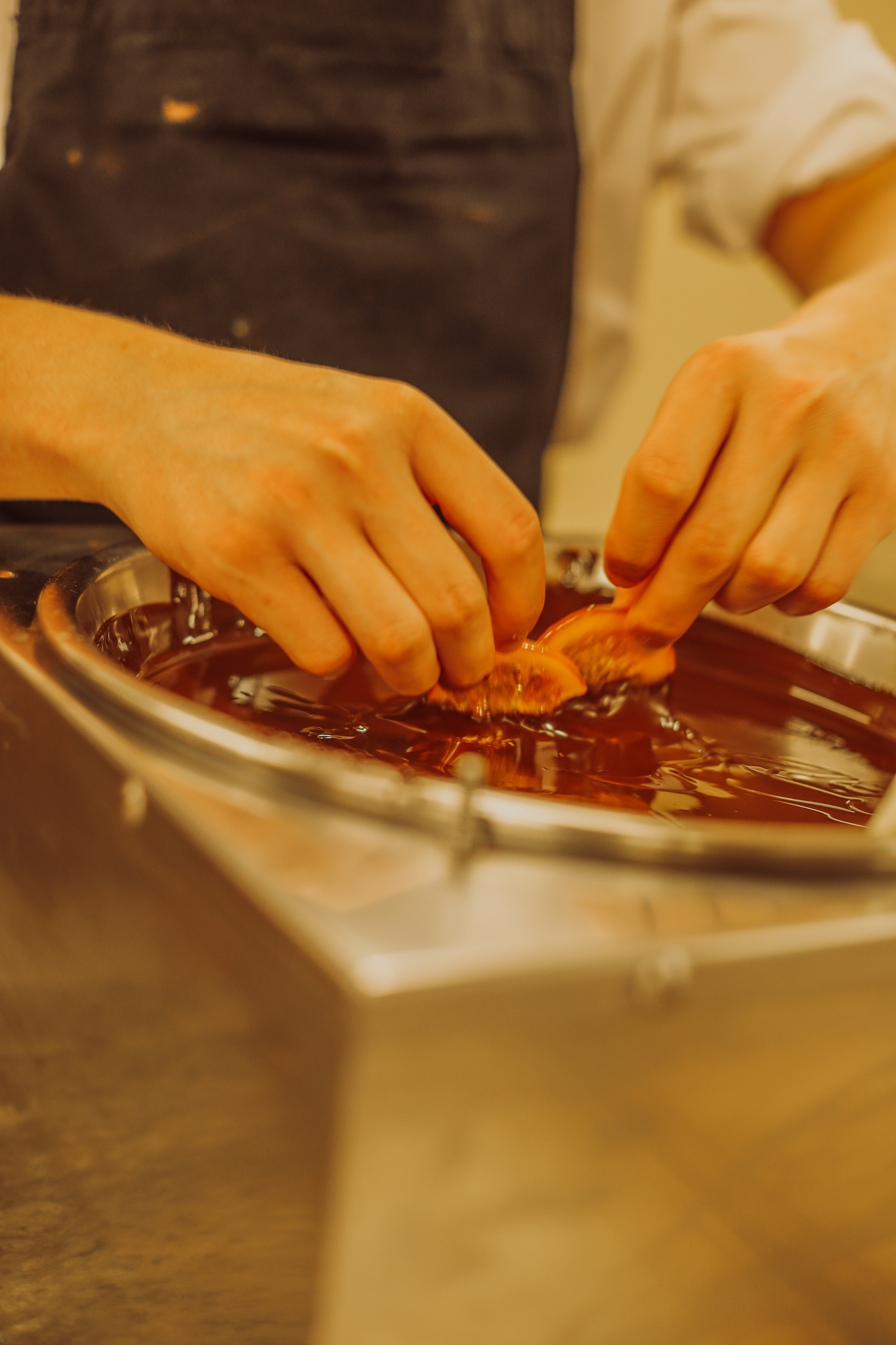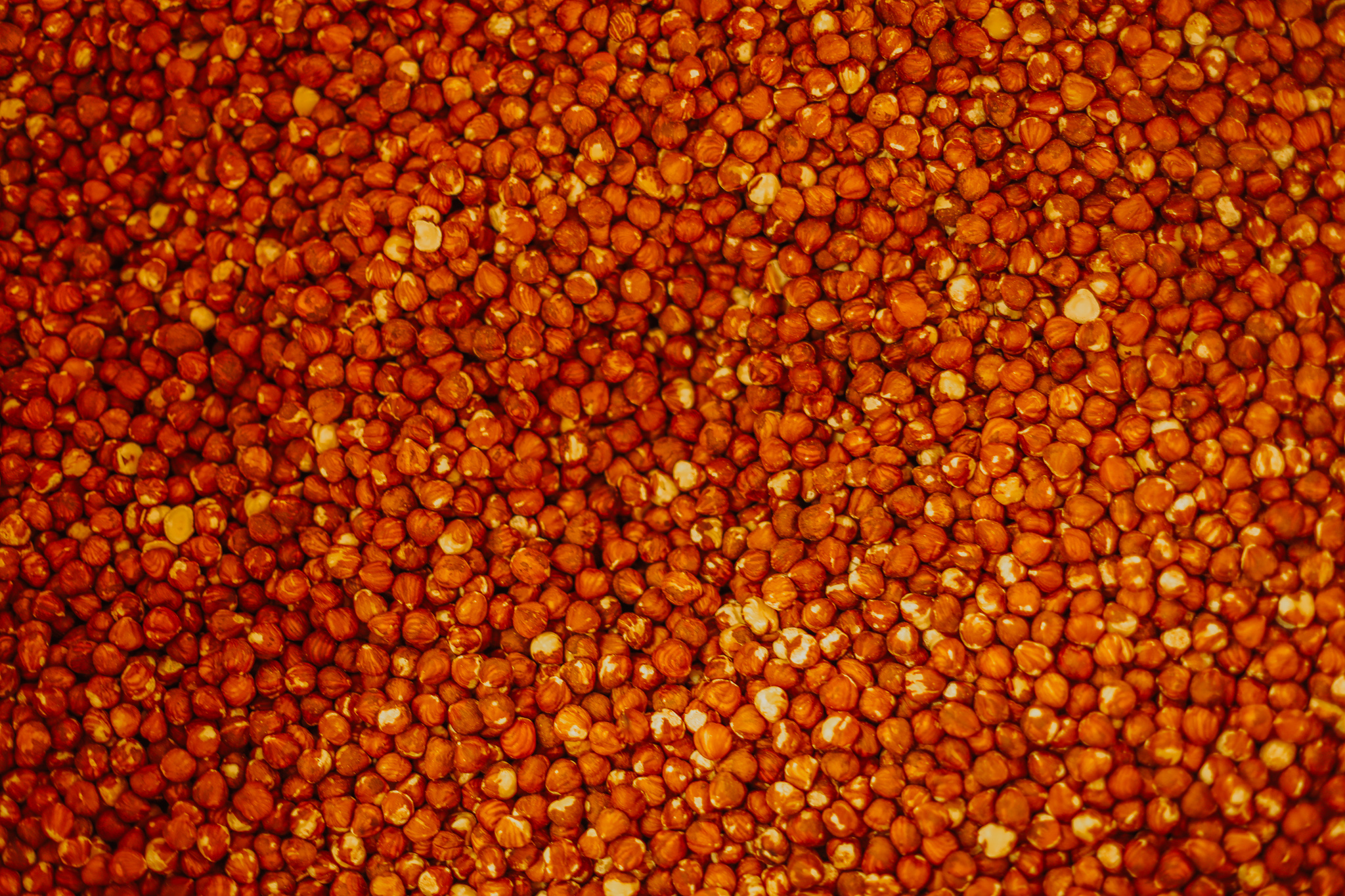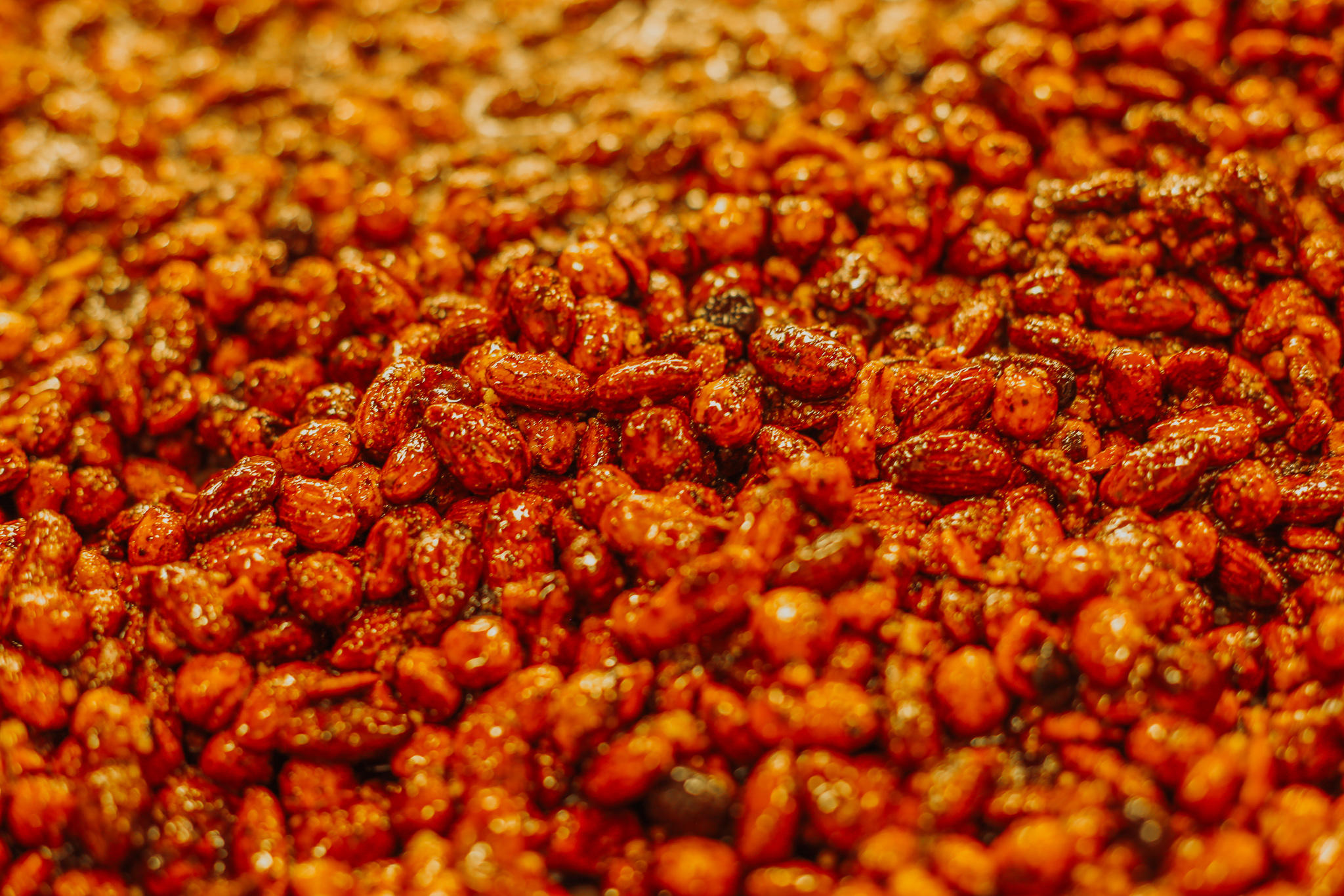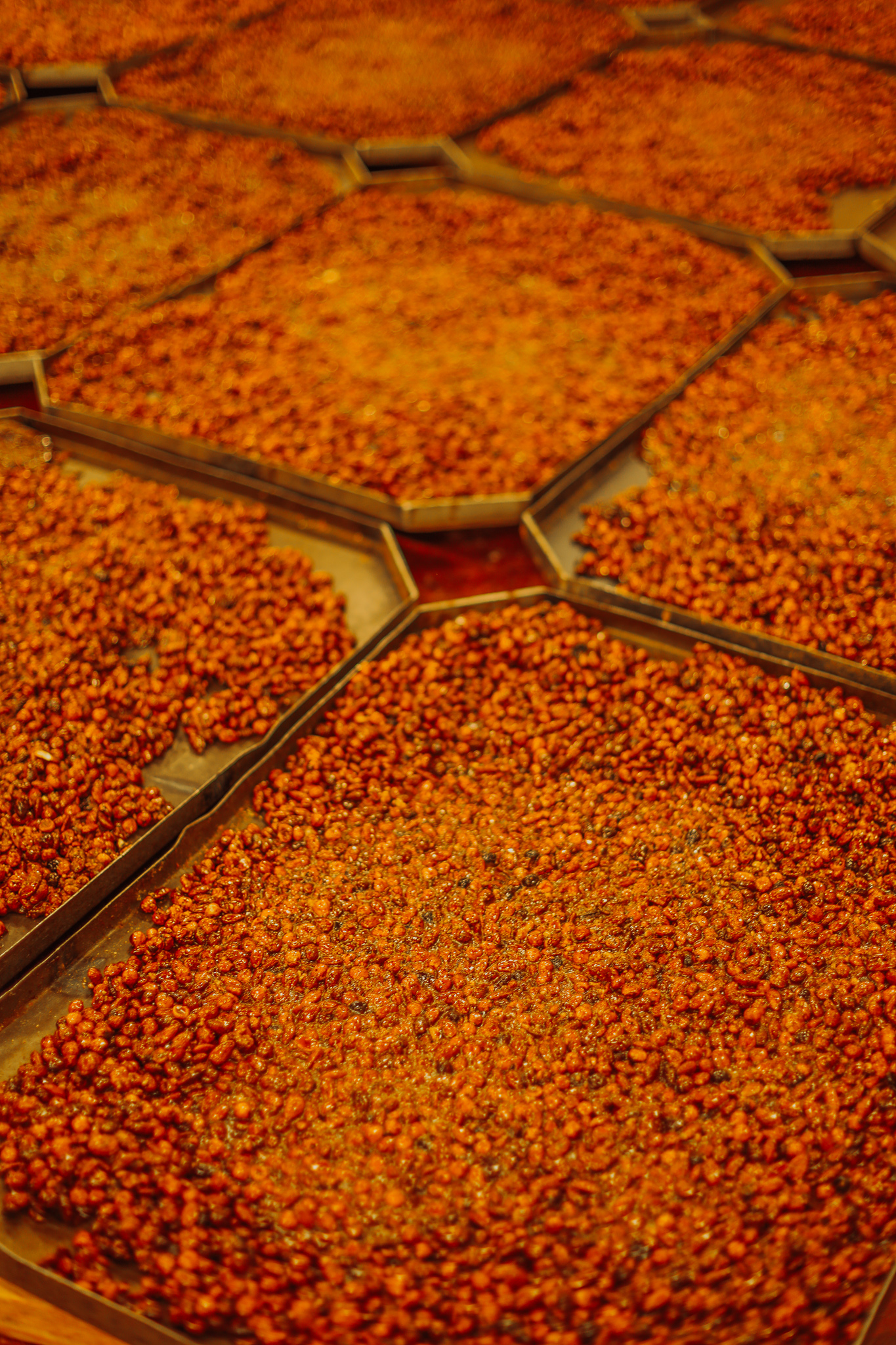 Les noisettes et amandes sont mélangés au sucre & caramélisées dans de grandes cuves en cuivre, puis étalées sur de grandes plaques de métal pendant plusieurs jours.
