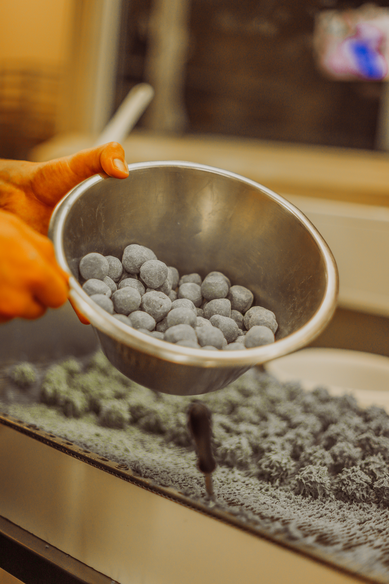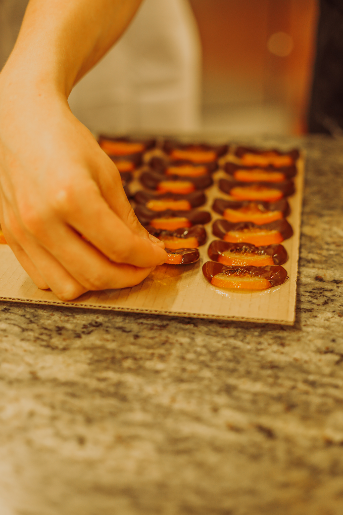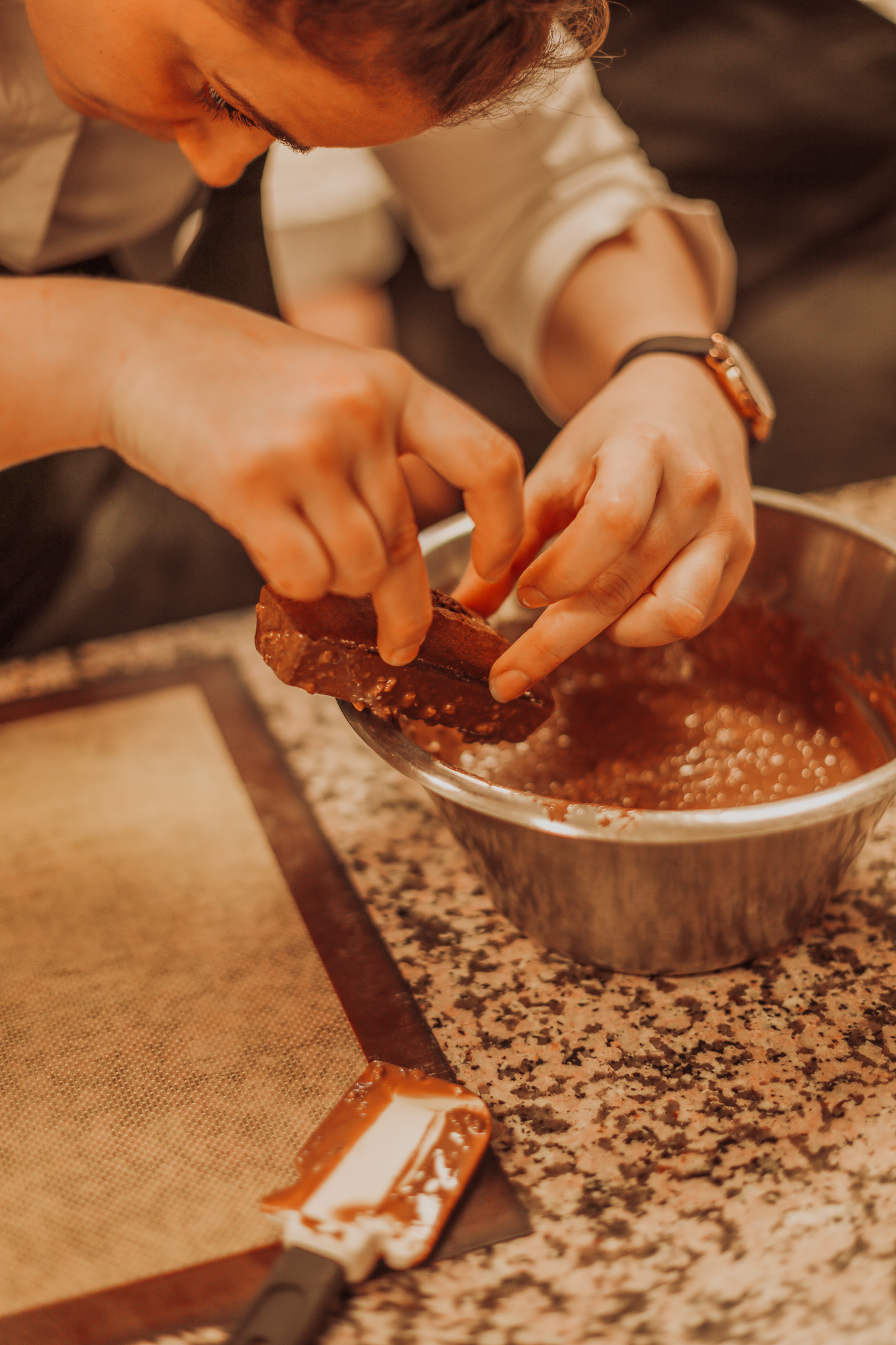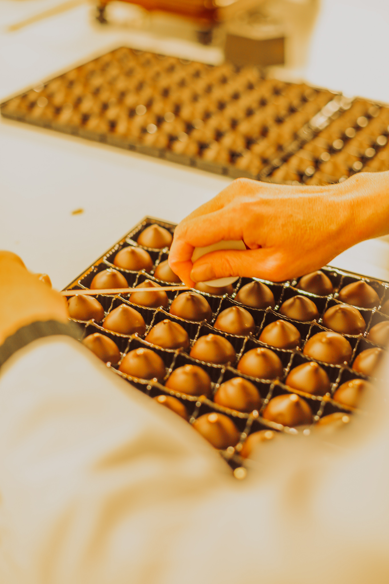 Si la fabrication du chocolat de couverture (c’est-à-dire le chocolat en “tablettes” ou en “pistoles”) est automatisée, la décoration des bonbons chocolats est, elle, faite à la main par des chefs chocolatiers, tout comme l’emballage de différents produits (par exemple les sucettes).