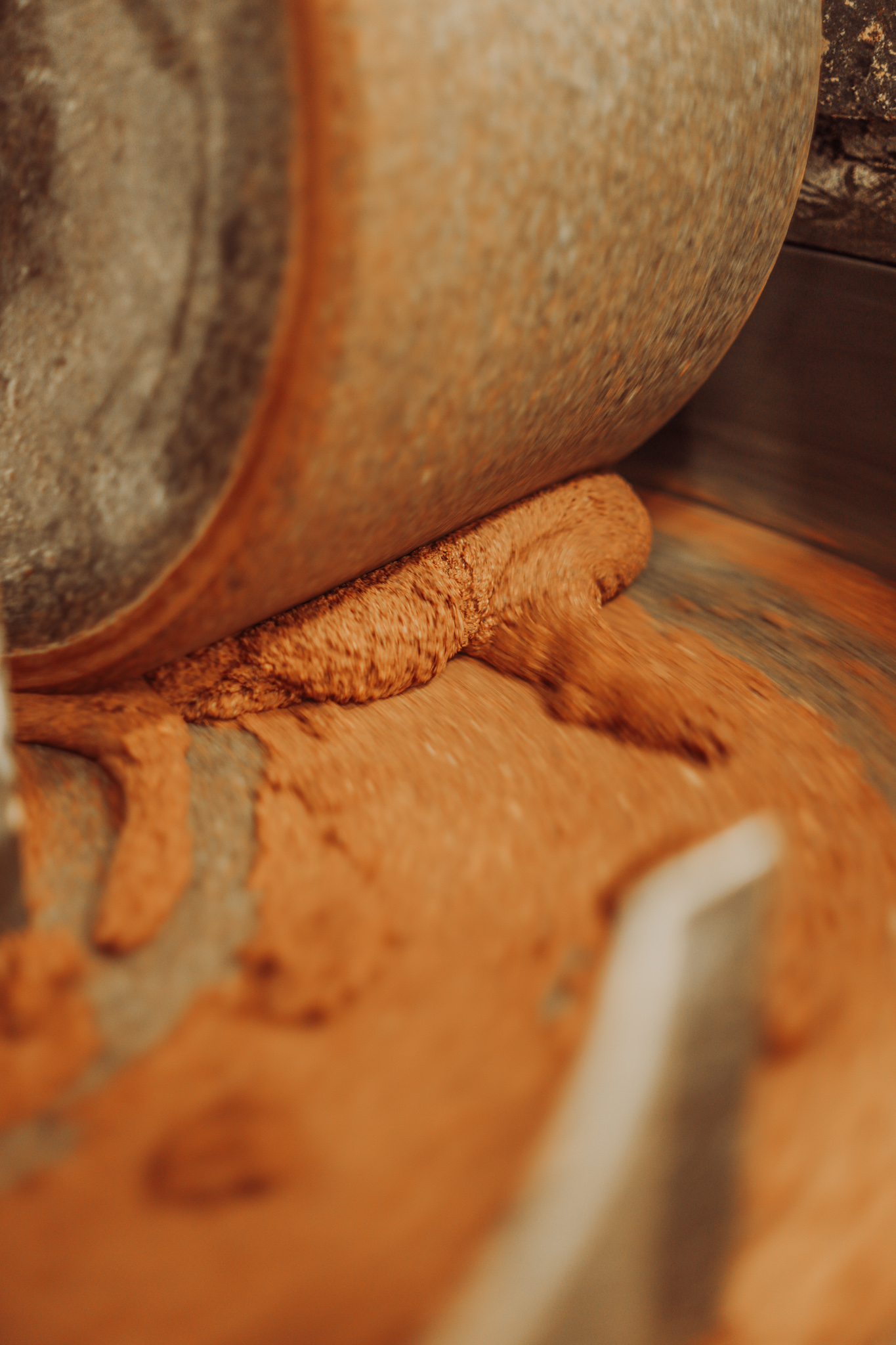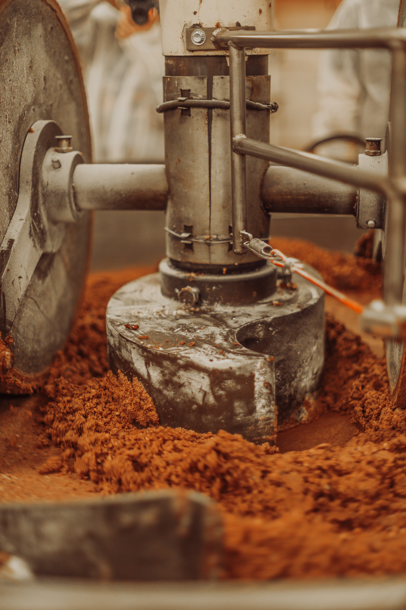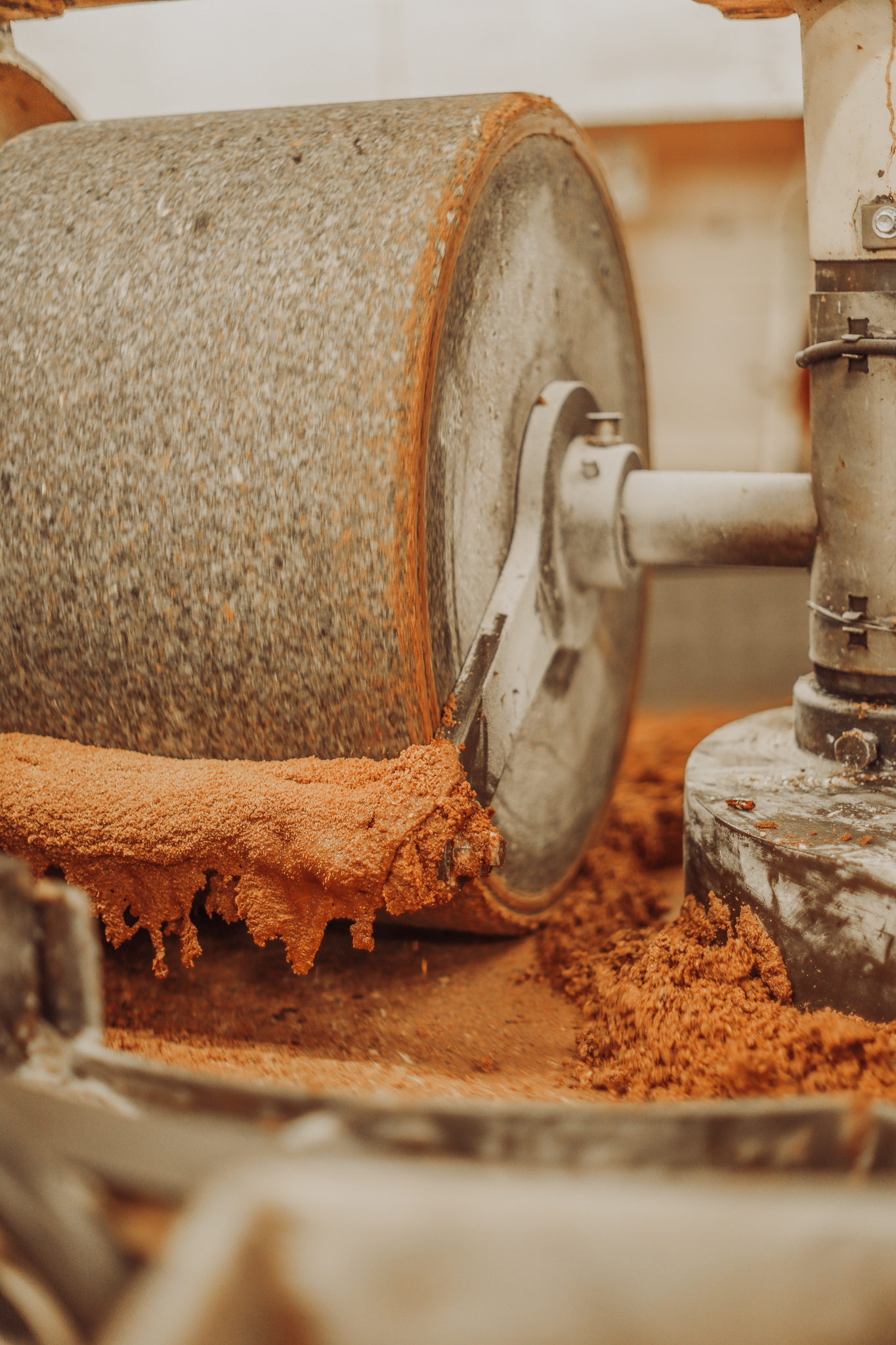 Ce mélange est ensuite broyé avec un meule en pierre (à l’ancienne), afin d’éviter le goût métallique que peut donner un mixeur en métal. Et si vous n’avez jamais goûté ce praliné, il faut absolument y remédier car il a un goût de folie (et non, ne léchez pas votre écran, ça ne sert à rien).