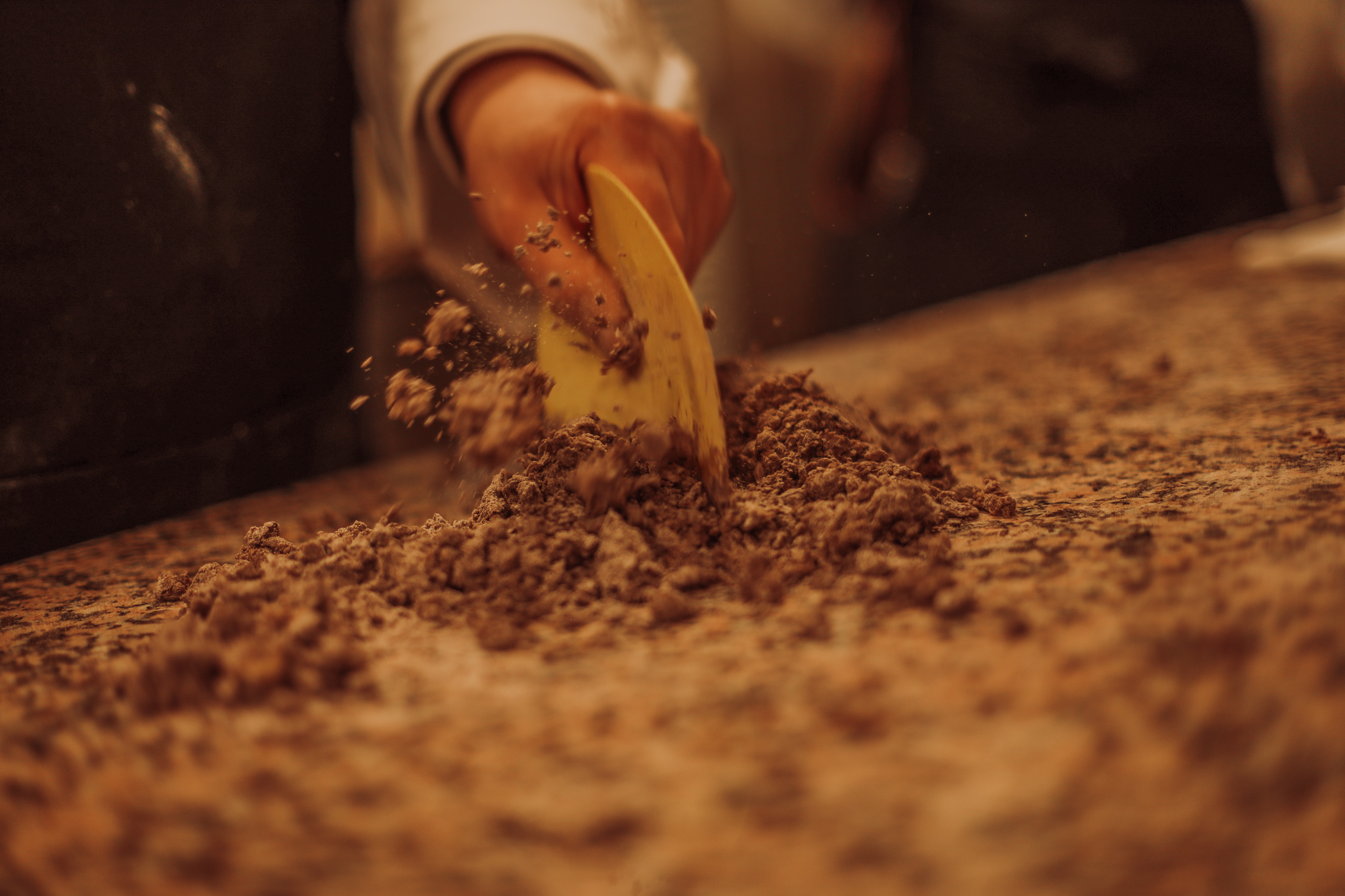 Le chocolat est ensuite concassé (et on obtient du grué de cacao) et broyé.