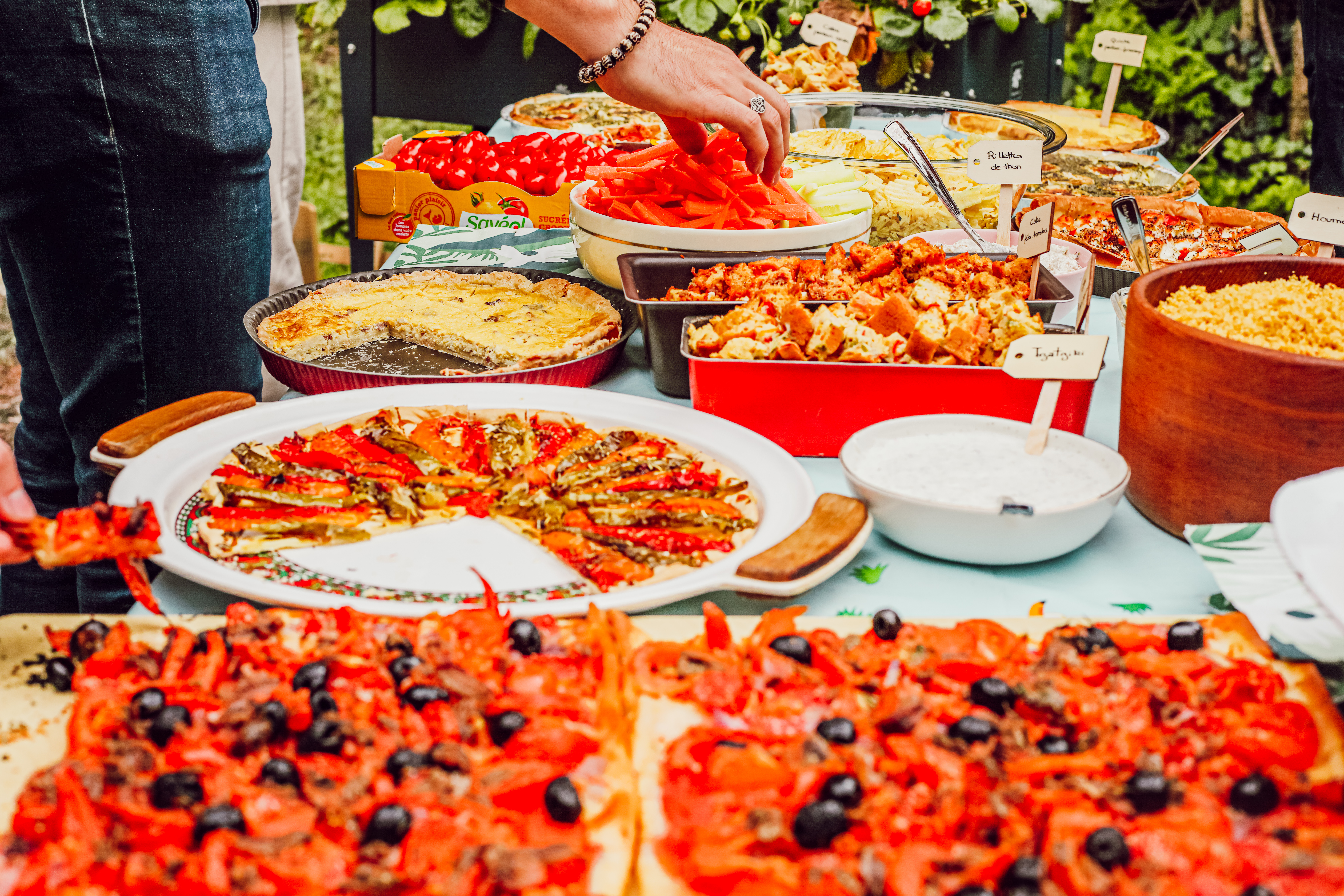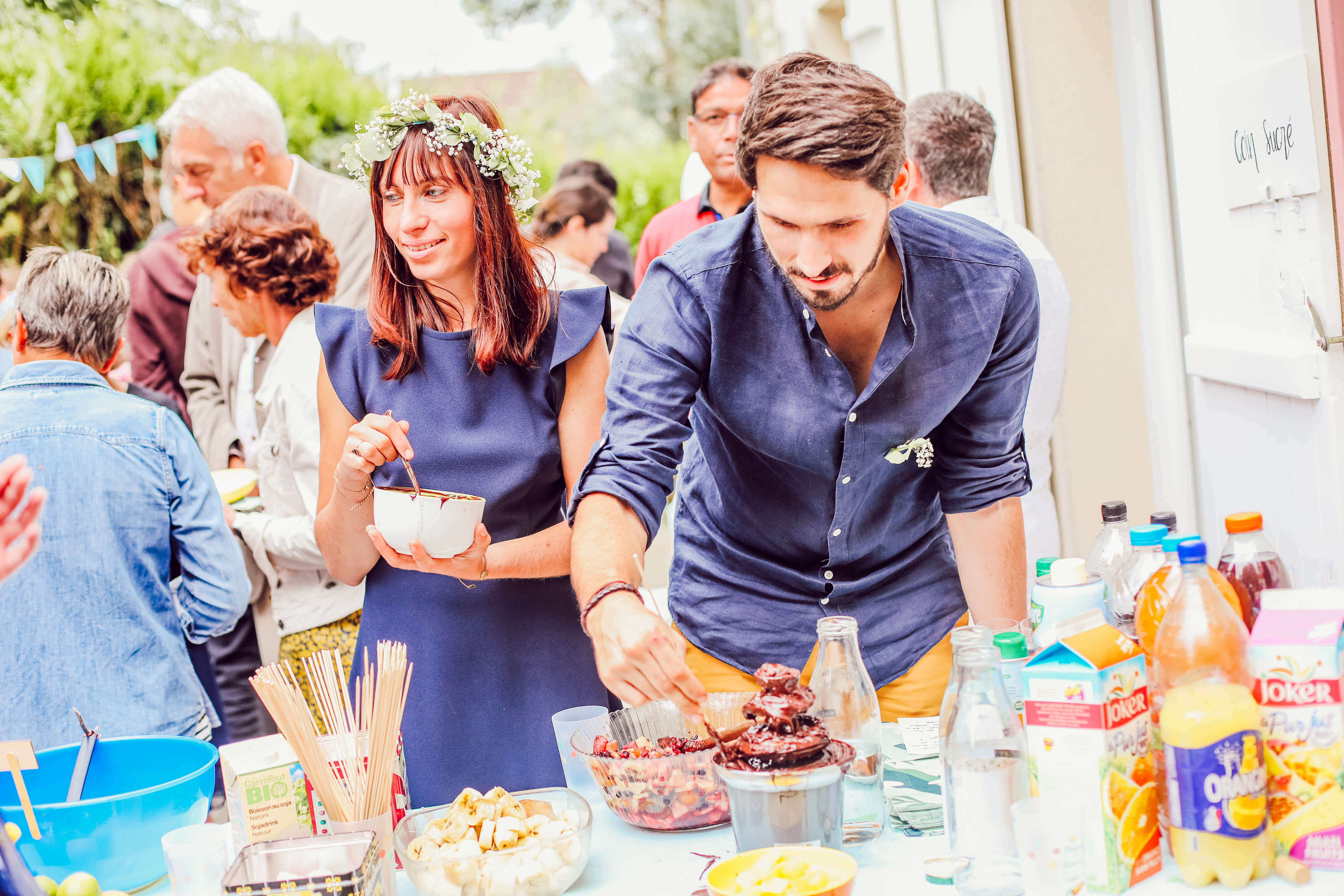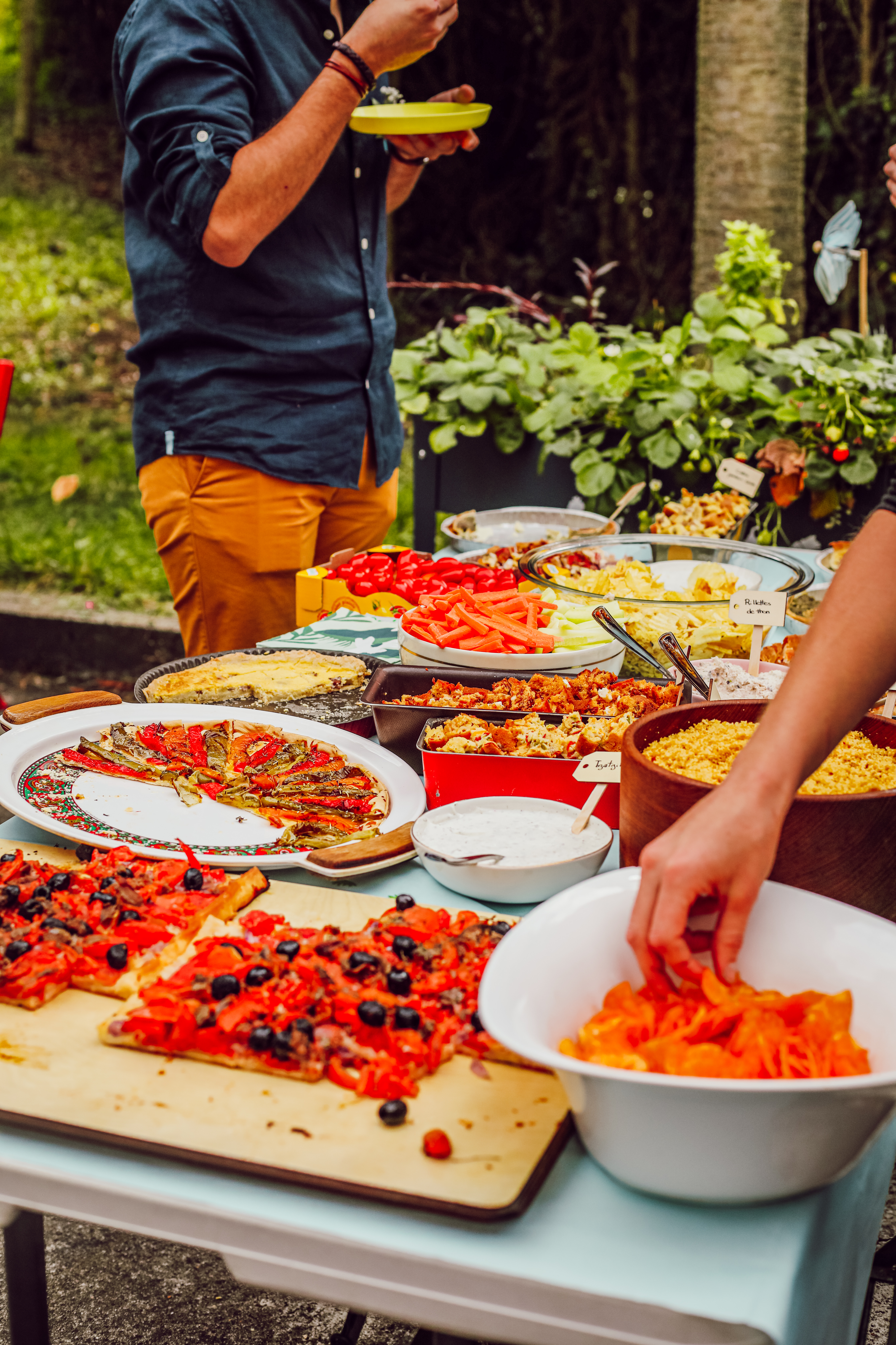 Je crois que le repas, c’est ce qui nous a fait le plus réfléchir, surtout que nous voulions tout faire nous-mêmes sans passer par un traiteur. Entre les plats à préparer, les quantités à estimer (la partie la plus dure je crois), l’organisation des plats pendants la fête, les allergies/intolérances/régimes alimentaires/goûts des nombreux invités, ça n’a pas été évident.