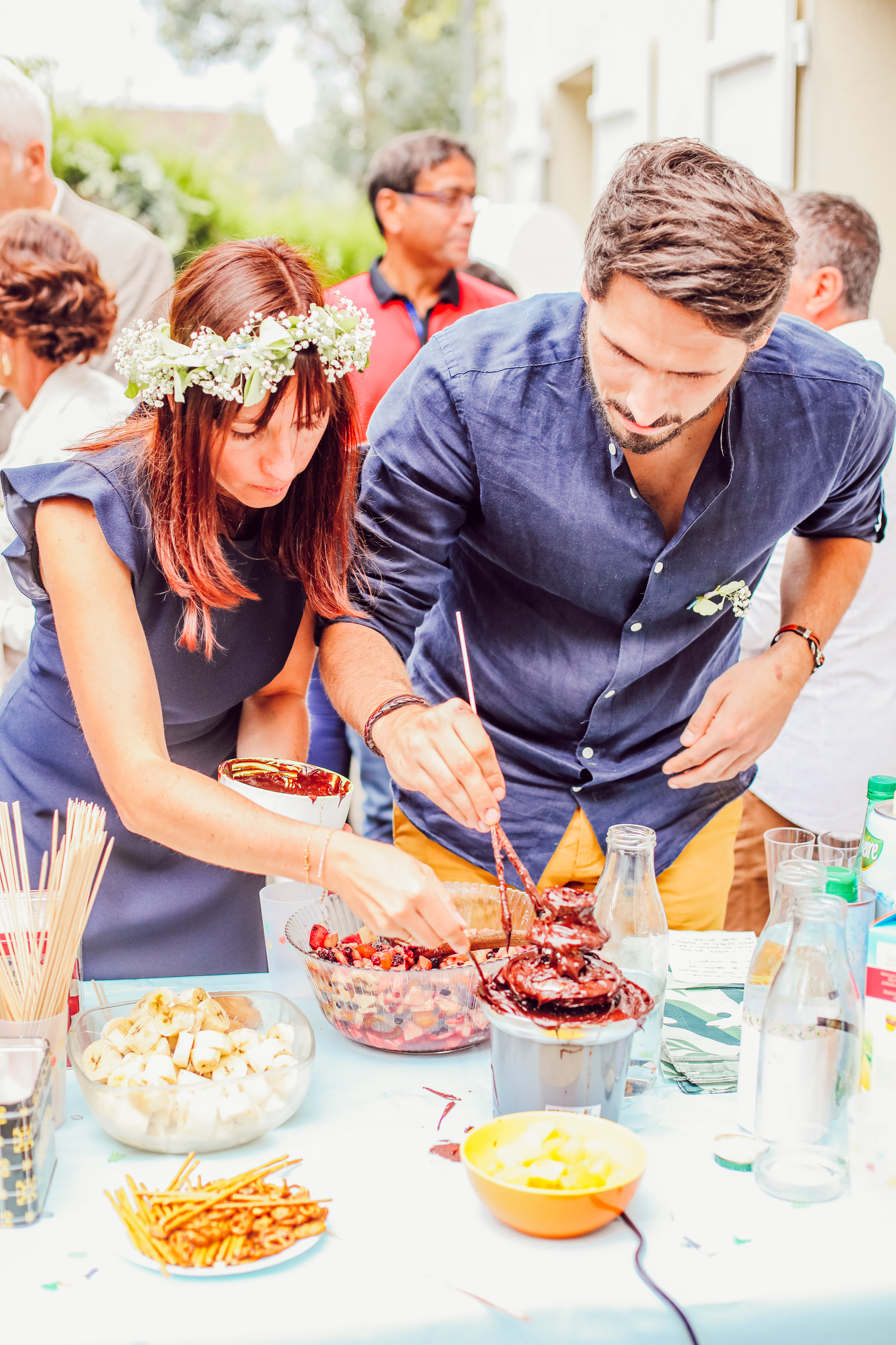 Pour le dessert, on voulait faire un truc un peu sympa. Alors après avoir hésité entre le bar à glace (mais compliqué à gérer en extérieur), la machine à barbe à papa (mais je n’aime pas ça donc le chéri m’a interdit de choisir quelque chose que je n’aimais pas), la crêpière (déjà faite par mon cousin l’an dernier), la machine à pop corn… nous avons finalement opté pour… une fontaine de chocolat. Bref, la gourmandise assurée et qui plait normalement à la plupart des invités.