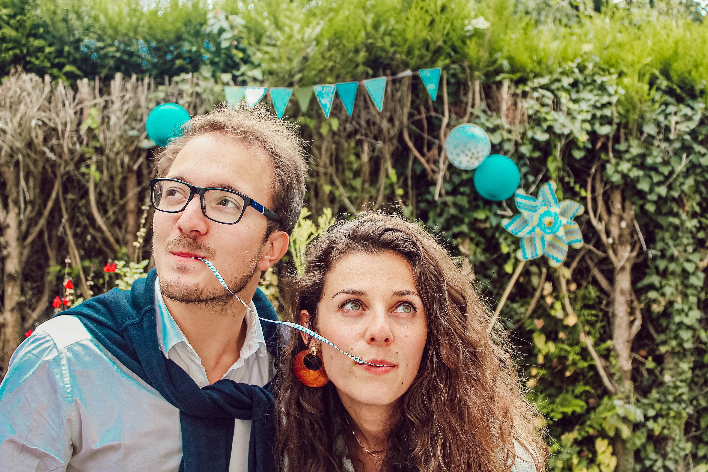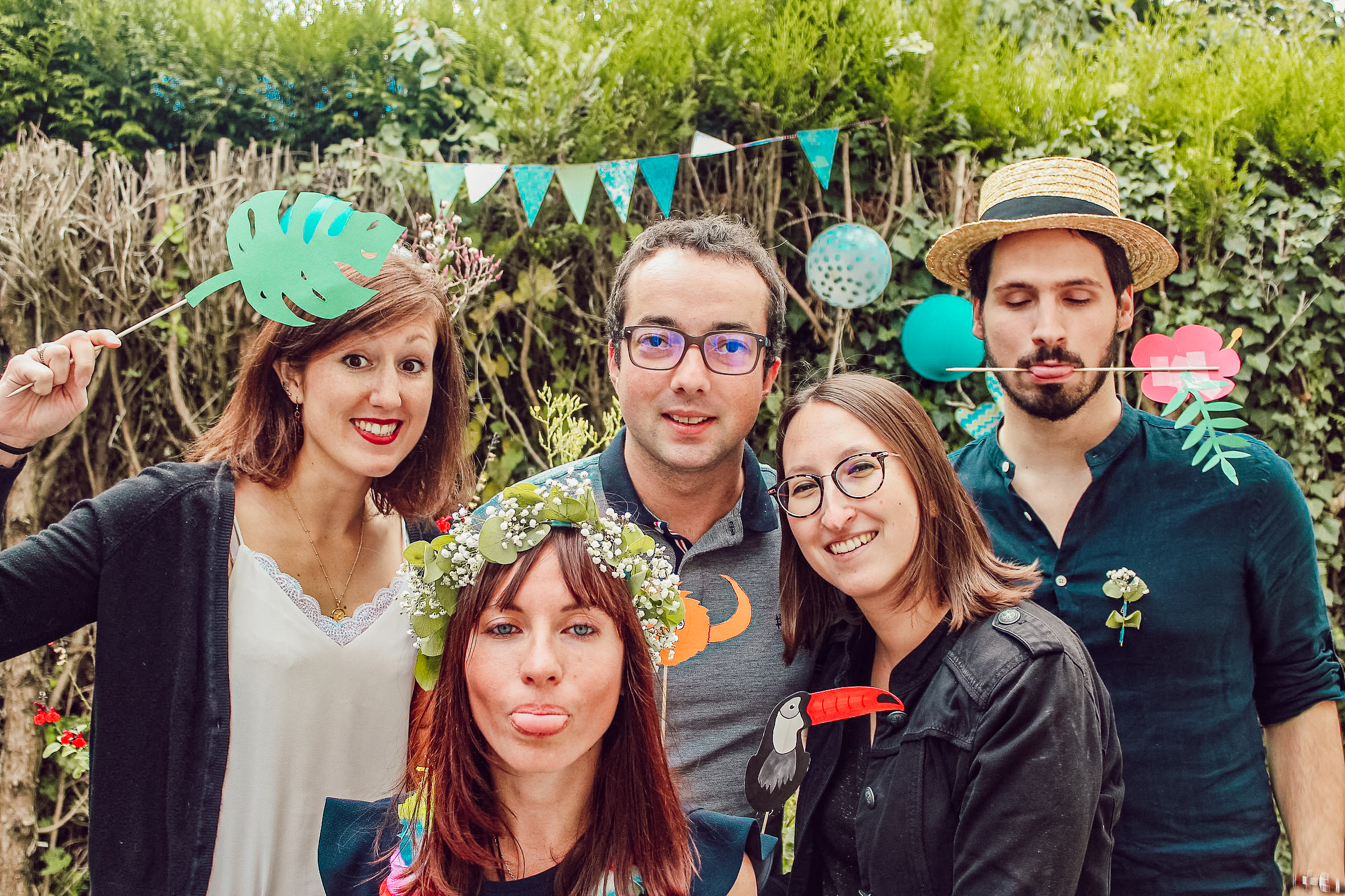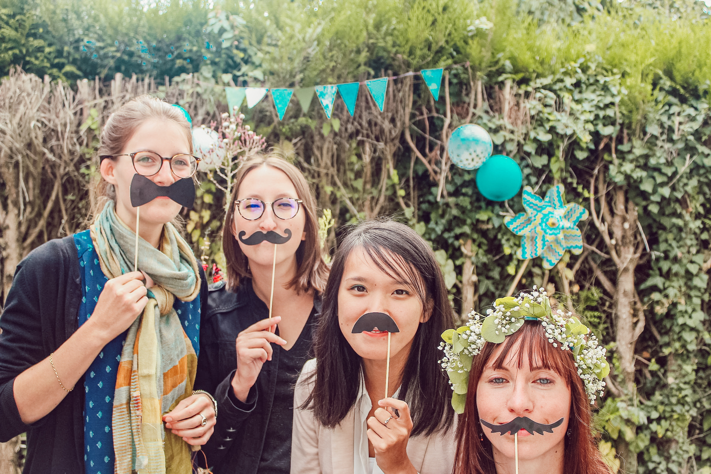 A côté de la photobooth, nous avions mis un joli carnet ainsi que des feutres, des stylos, des tampons et du masking tape pour que les invités puissent coller les photos dans le carnet et nous laisser un petit message. Une sorte de livre d’or mais avec des photos souvenirs. J’avais aussi apporté des accessoires (lunettes colorées, chapeaux,…) et fabriqués des accessoires photobooth en papier pour faire des photos rigolotes.