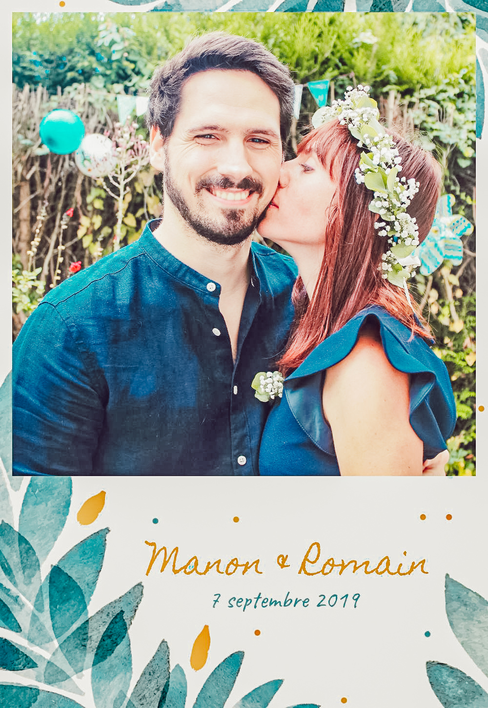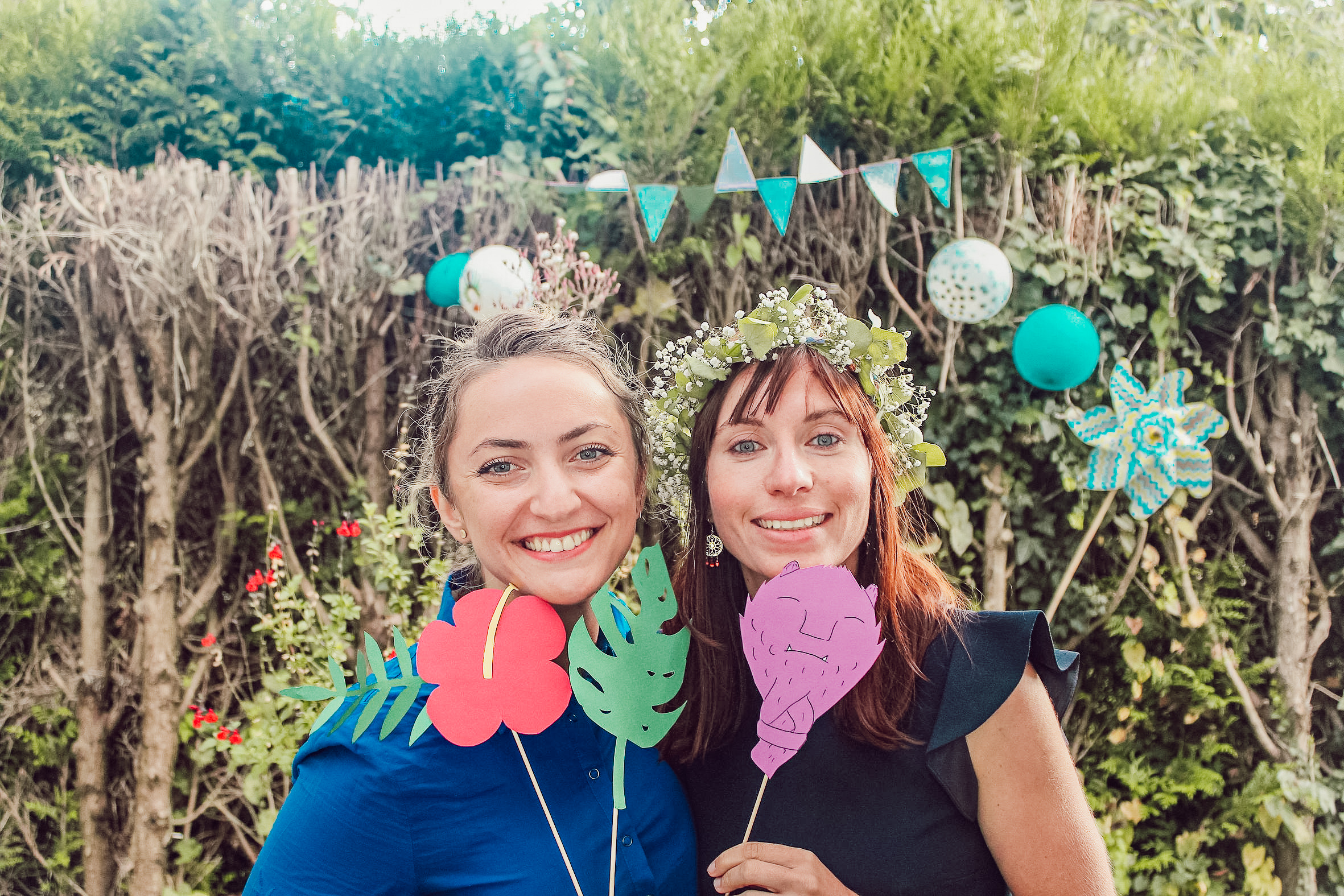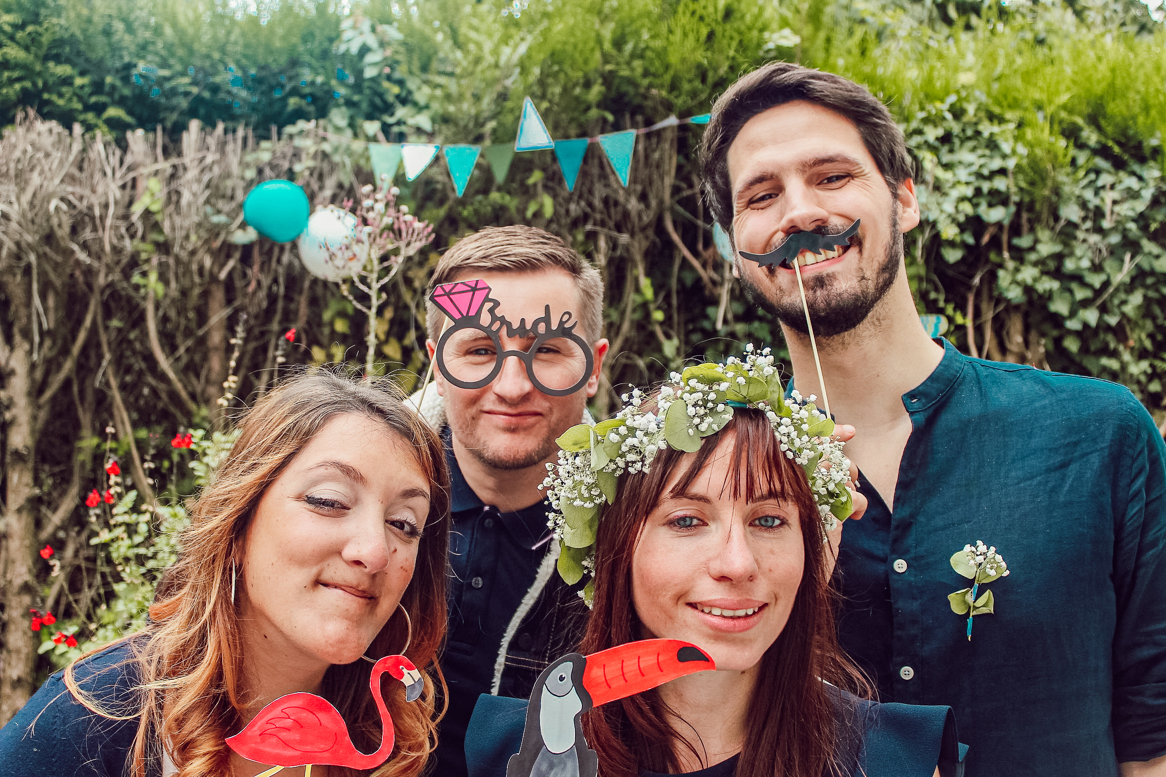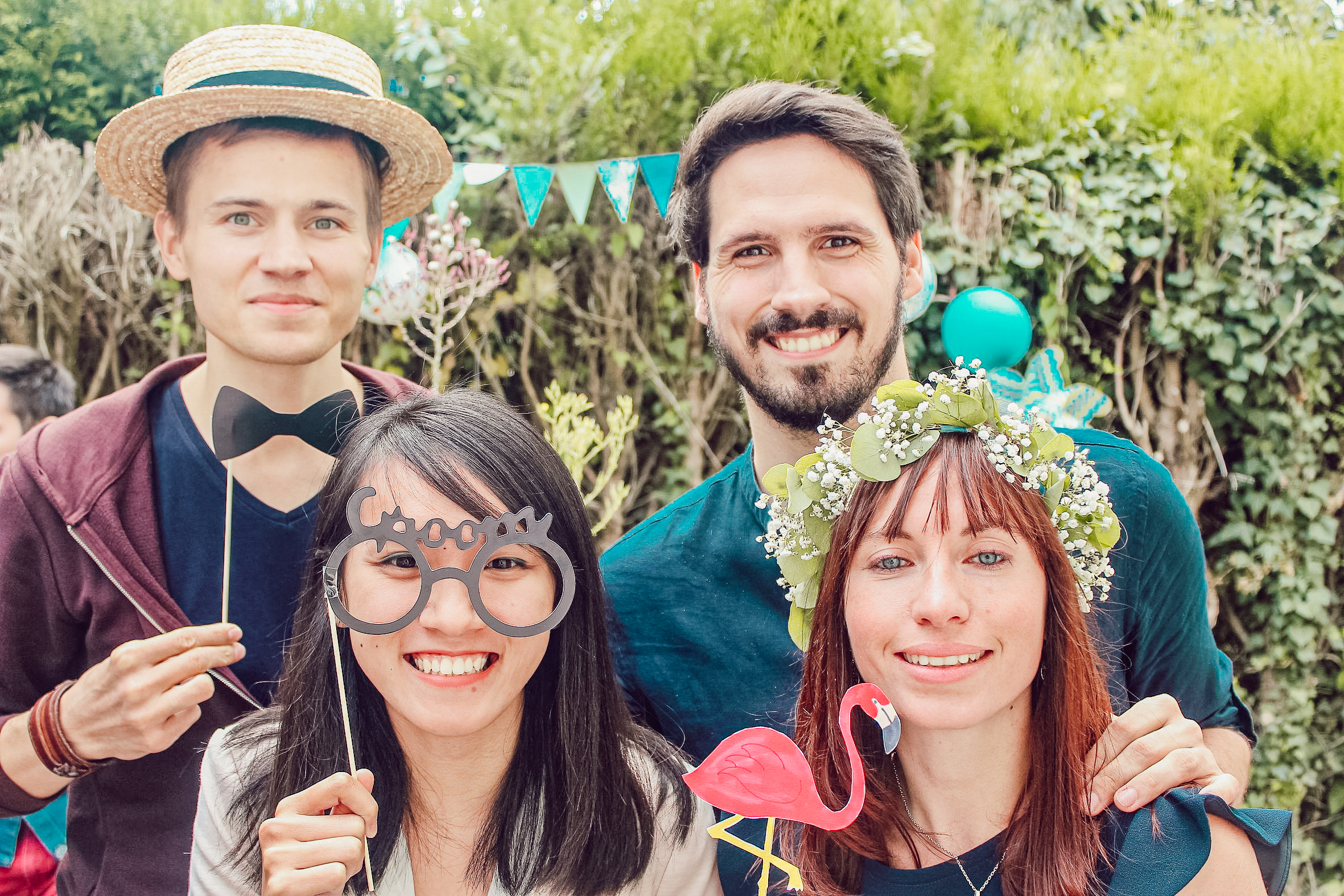 A côté de la photobooth, nous avions mis un joli carnet ainsi que des feutres, des stylos, des tampons et du masking tape pour que les invités puissent coller les photos dans le carnet et nous laisser un petit message. Une sorte de livre d’or mais avec des photos souvenirs. J’avais aussi apporté des accessoires (lunettes colorées, chapeaux,…) et fabriqués des accessoires photobooth en papier pour faire des photos rigolotes.