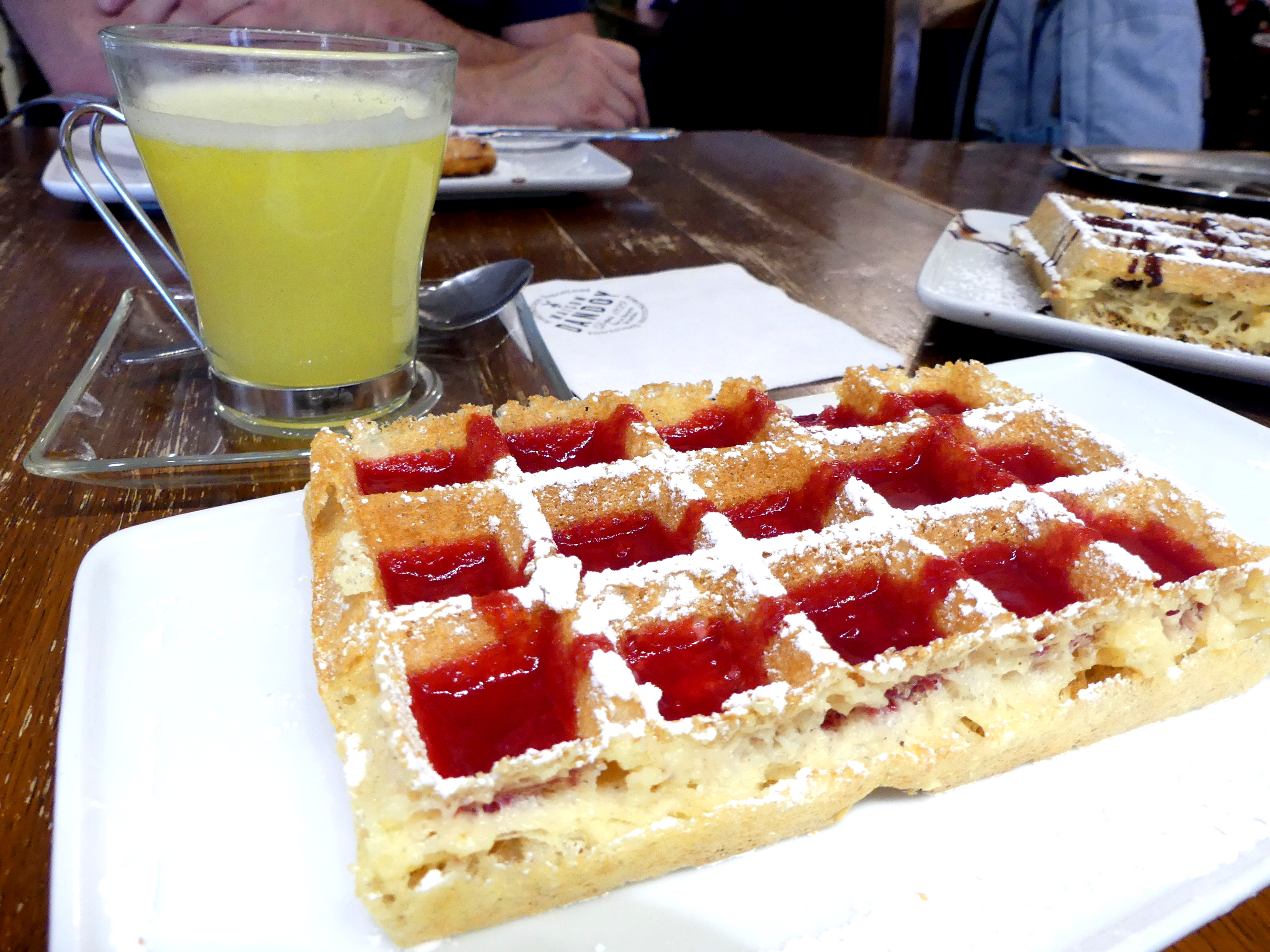 15h – Petite pause gourmande dans THE institution bruxelloise du salon de thé : Maison Dandoy. Comme qui dit Belgique dit gaufre, nous nous sommes laissés tenter, ma maman et moi, par la version bruxelloise (gaufre de forme rectangulaire composées de 24 carrés). Mon papa, quant à lui, a testé la version liégeoise. Un délice, la gaufre était bien aérienne, assez légère et avec un petit goût de bière :).