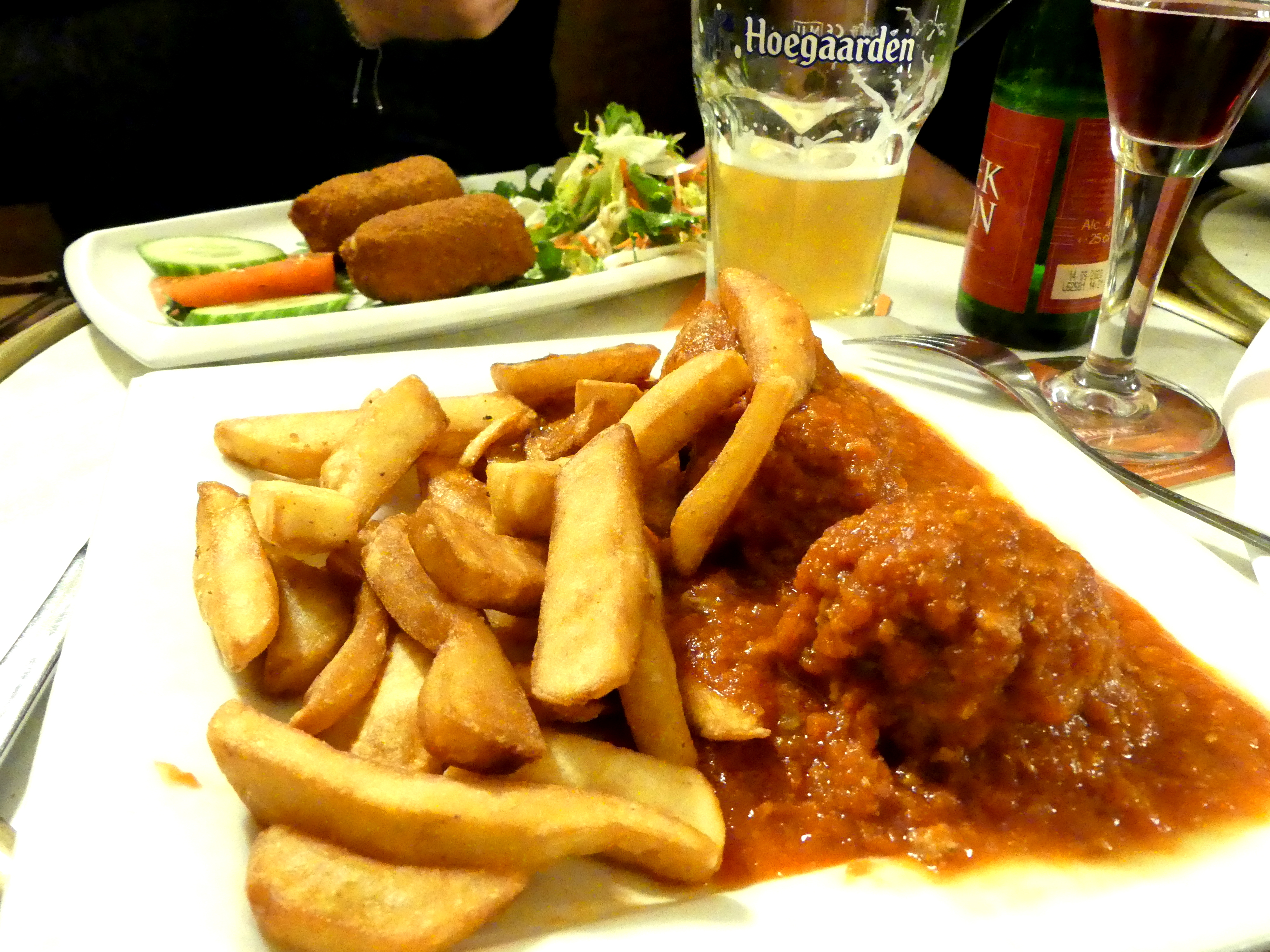 20h – Directement une taverne typiquement belge pour dîner et boire une bonne bière : … La carte des bières (toutes belges) était monstrueuse. Pour le dîner, spécialités belges of course : carbonade, boulettes de boeuf à la tomate & beignets de crevettes, le tout accompagné de frites. Très bon, même si la cuisine belge n’est pas réputée pour être légère.